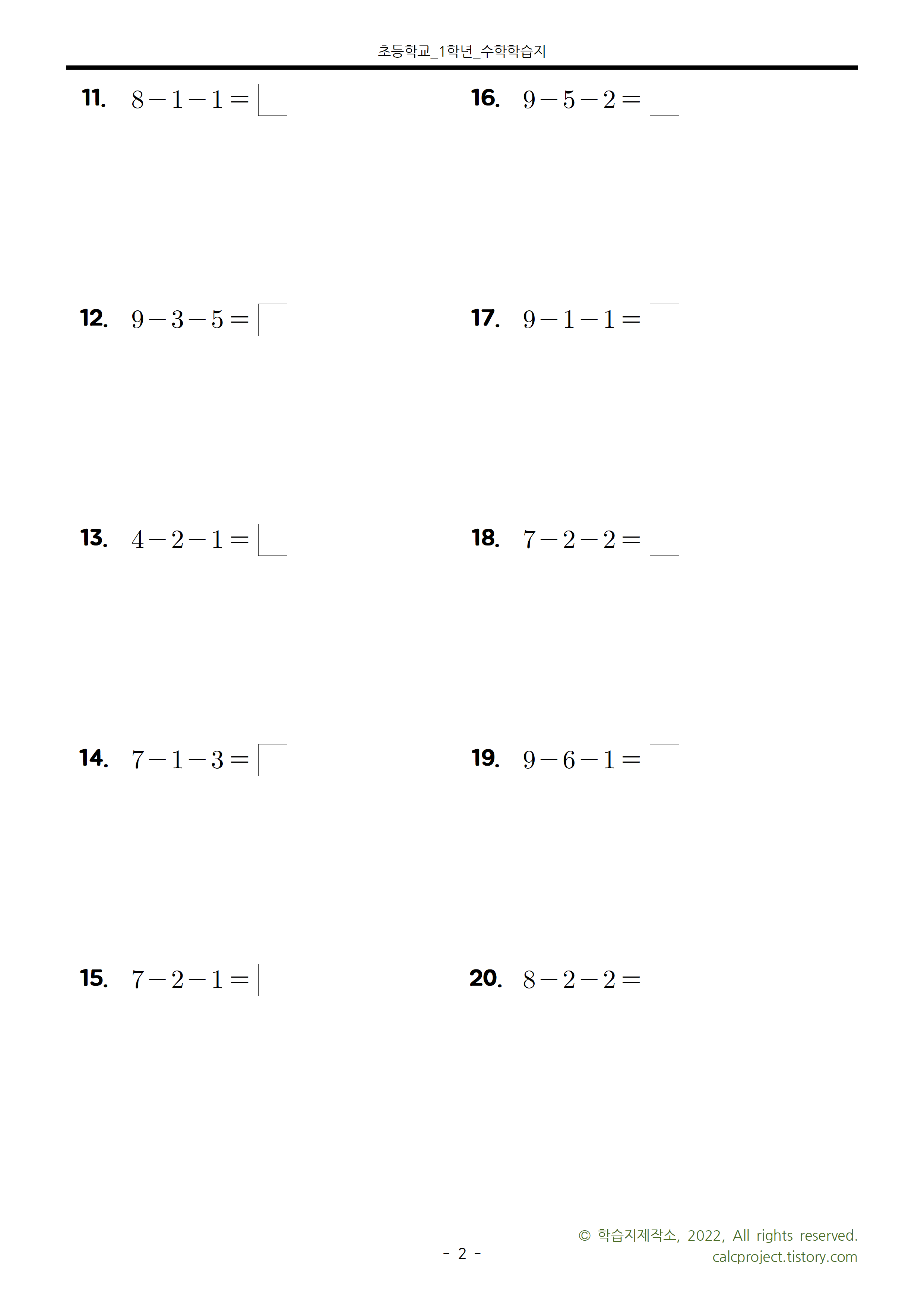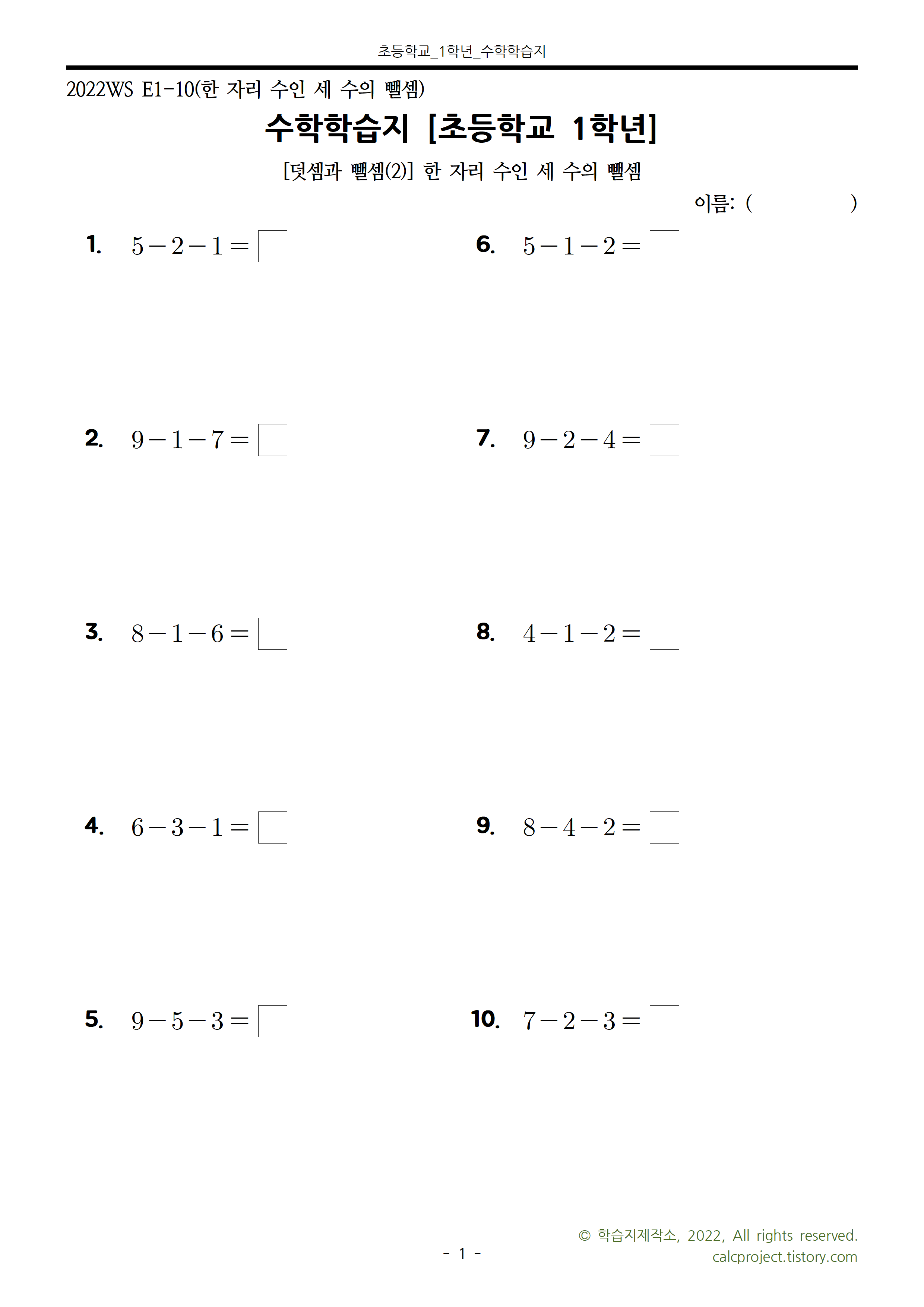 이번 학습지는 세 수의 뺄셈으로, 한 자리 수인 세 수의 뺄셈 30문제로 만들었습니다.