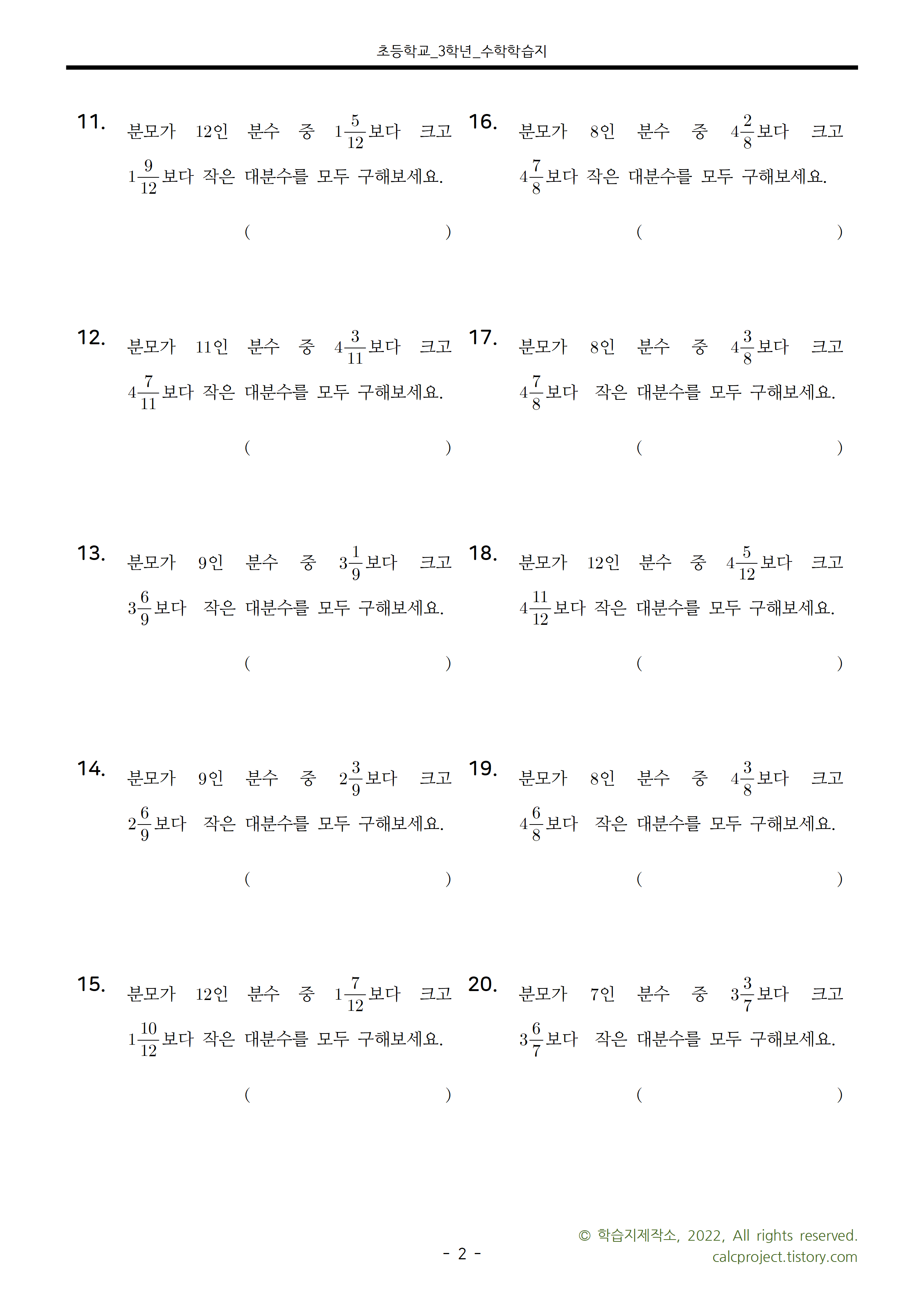 학습지는 모두 20문제로, 범위 안의 대분수를 모두 찾아 쓰는 문항입니다.