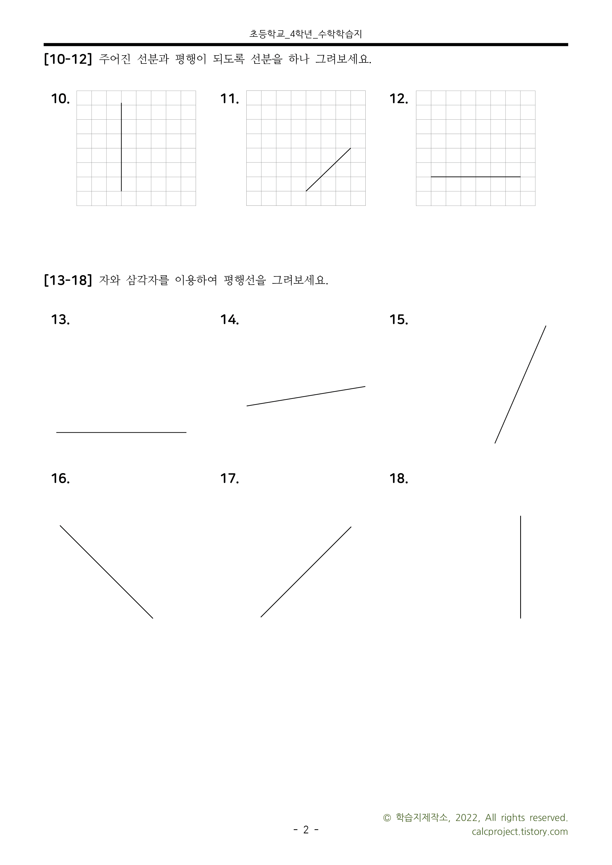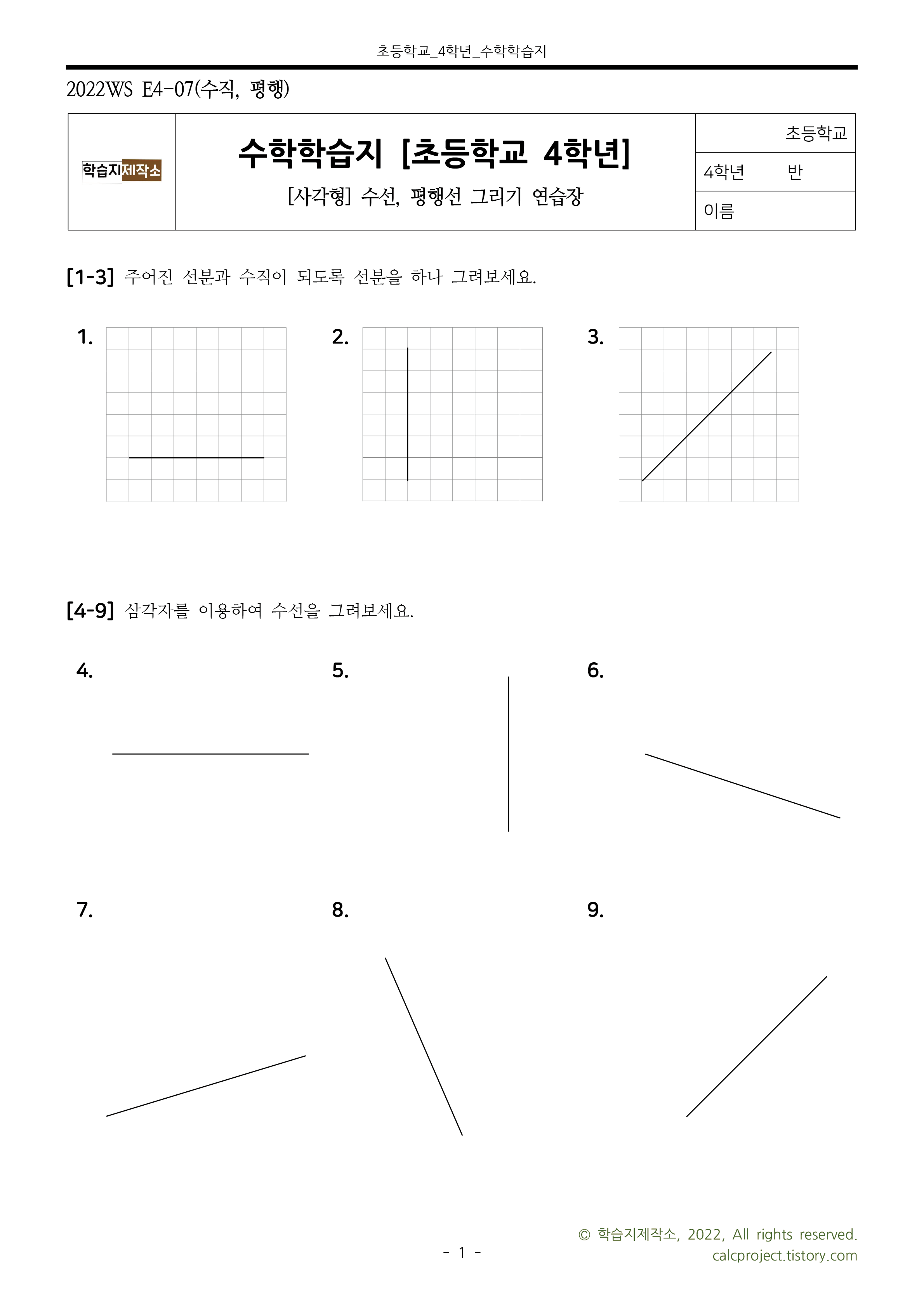 이번 시간에는 수선, 평행선 그리기 연습장을 준비해보았습니다.