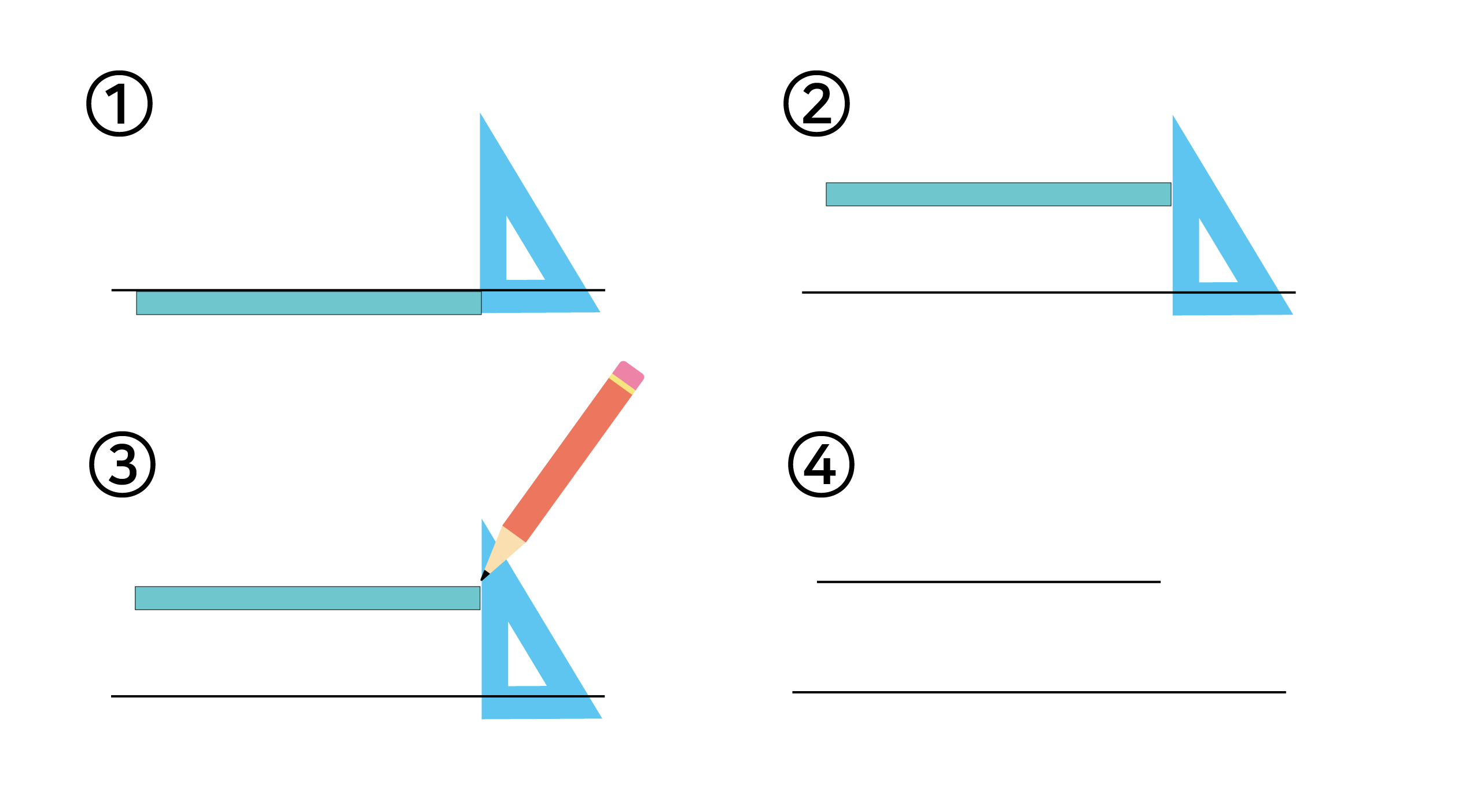 ① 직선과 맞닿도록 자를 놓고, 그 옆에 삼각자를 맞닿게 합니다.