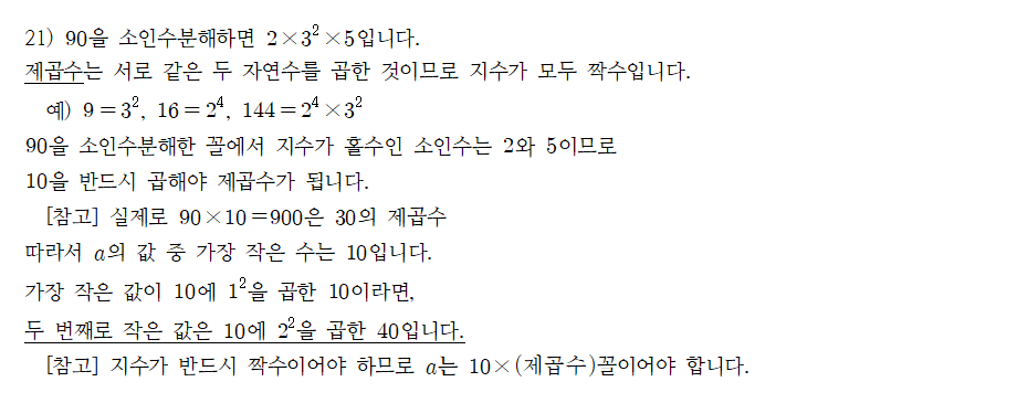 예제) 90에 자연수 $a$를 곱하여 어떤 자연수의 제곱이 되도록 할 때, $a$의 값 중 두 번째로 작은 자연수를 구하시오.