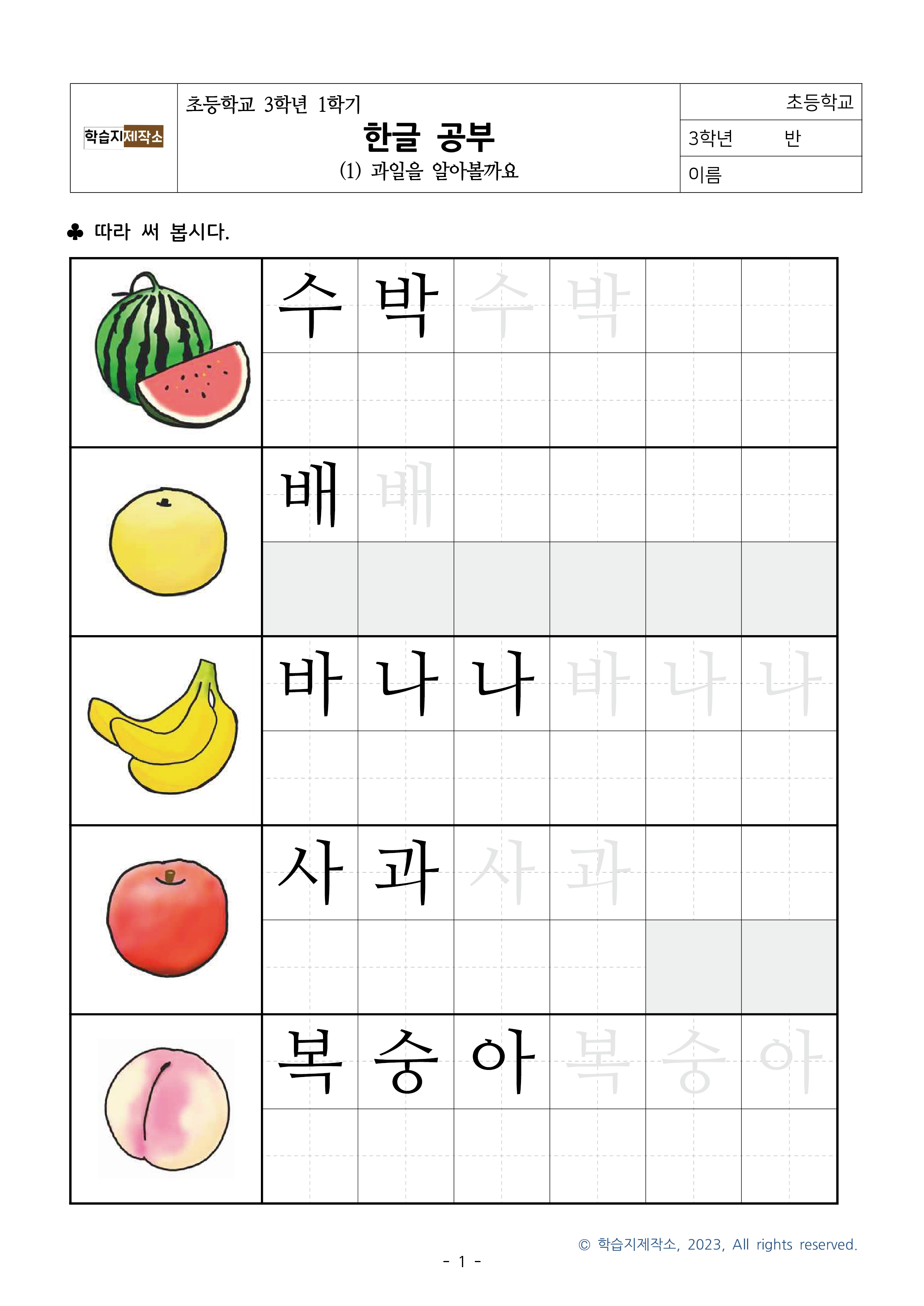 오늘은 '과일'을 주제로 낱말 학습지를 나누어보았습니다.