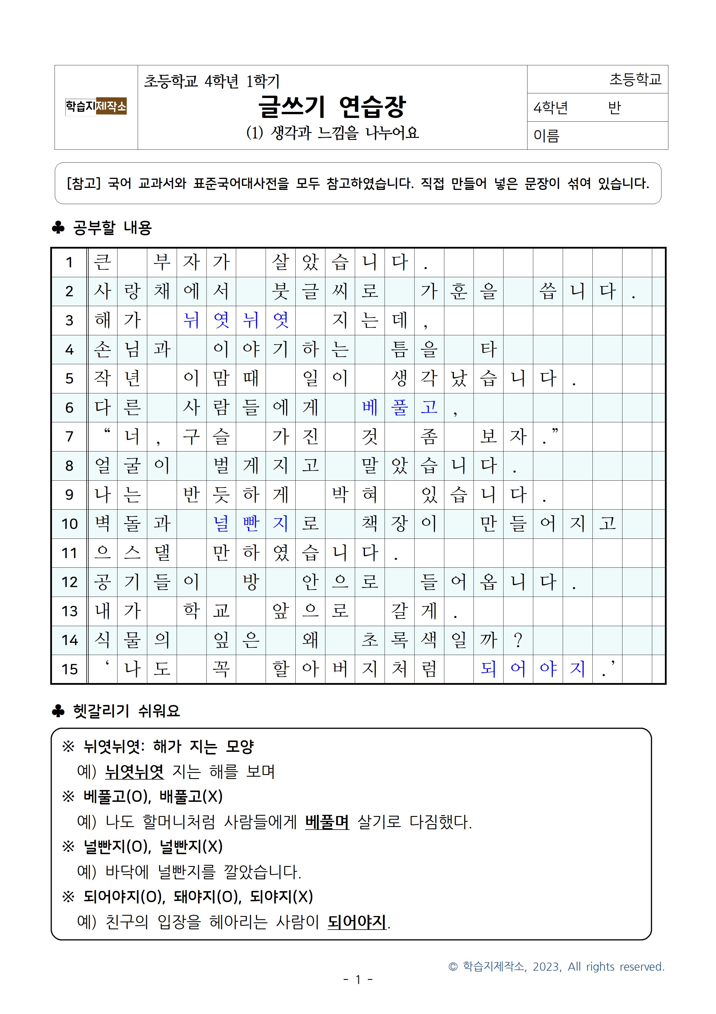 [2023-01-07 안내] 초등학교 4학년 글쓰기 연습장은 매주 월요일 오전 8시에 업로드됩니다. 1학기 1. 생각과 느낌을 나누어요 글쓰기 연습장[받아쓰기] 2023.1.9. 2. 내용을 간추려요 글쓰기 연습장[받아