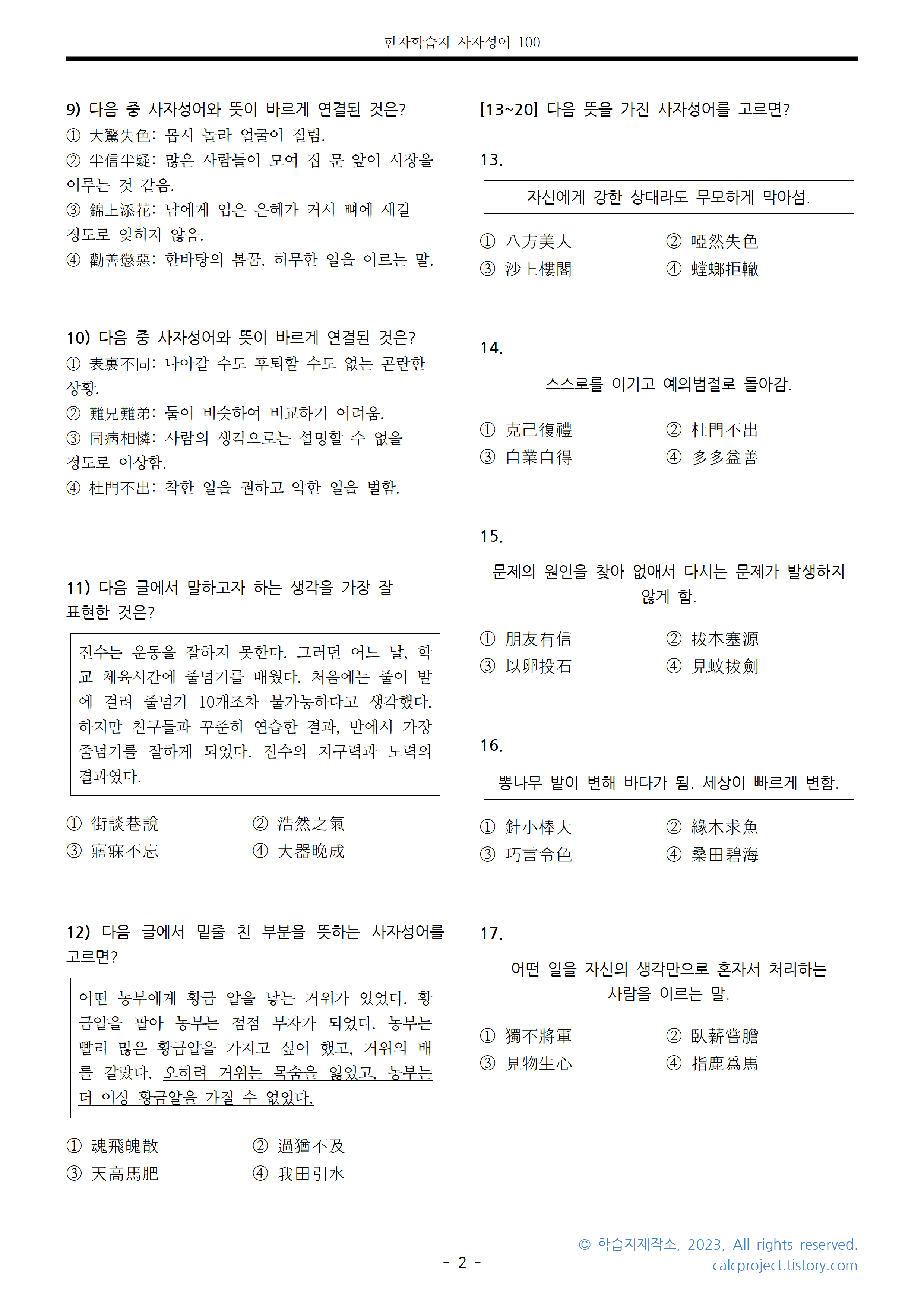 복습용으로 사용하셔도 좋고, 자신이 사자성어를 잘 알고 있는지 점검하시는 용도로 활용하셔도 좋습니다.