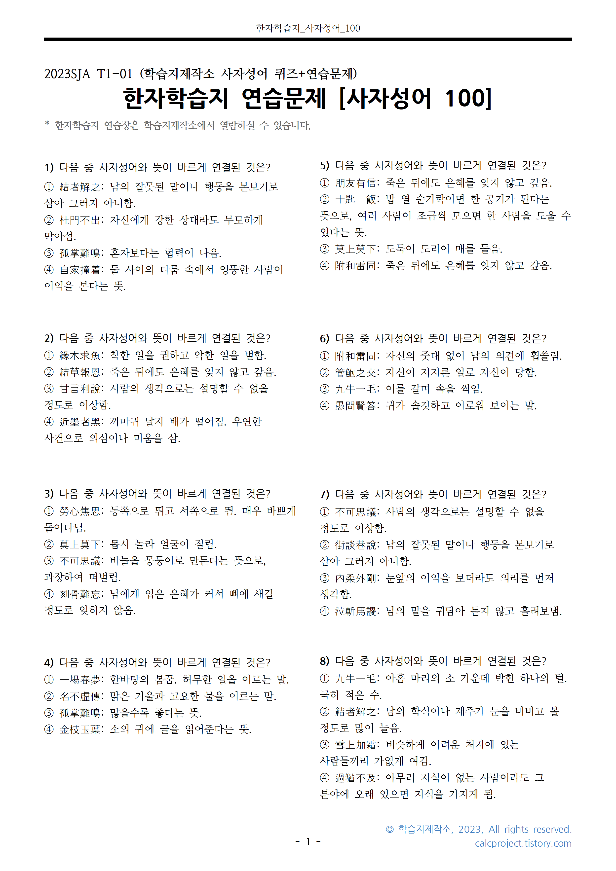공부했던 100개의 사자성어를 복습할 수 있도록 만들었습니다.