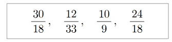 $\cfrac{30}{18}$에서 분자와 분모의 최대공약수는 $6$이므로 기약분수가 아닙니다.