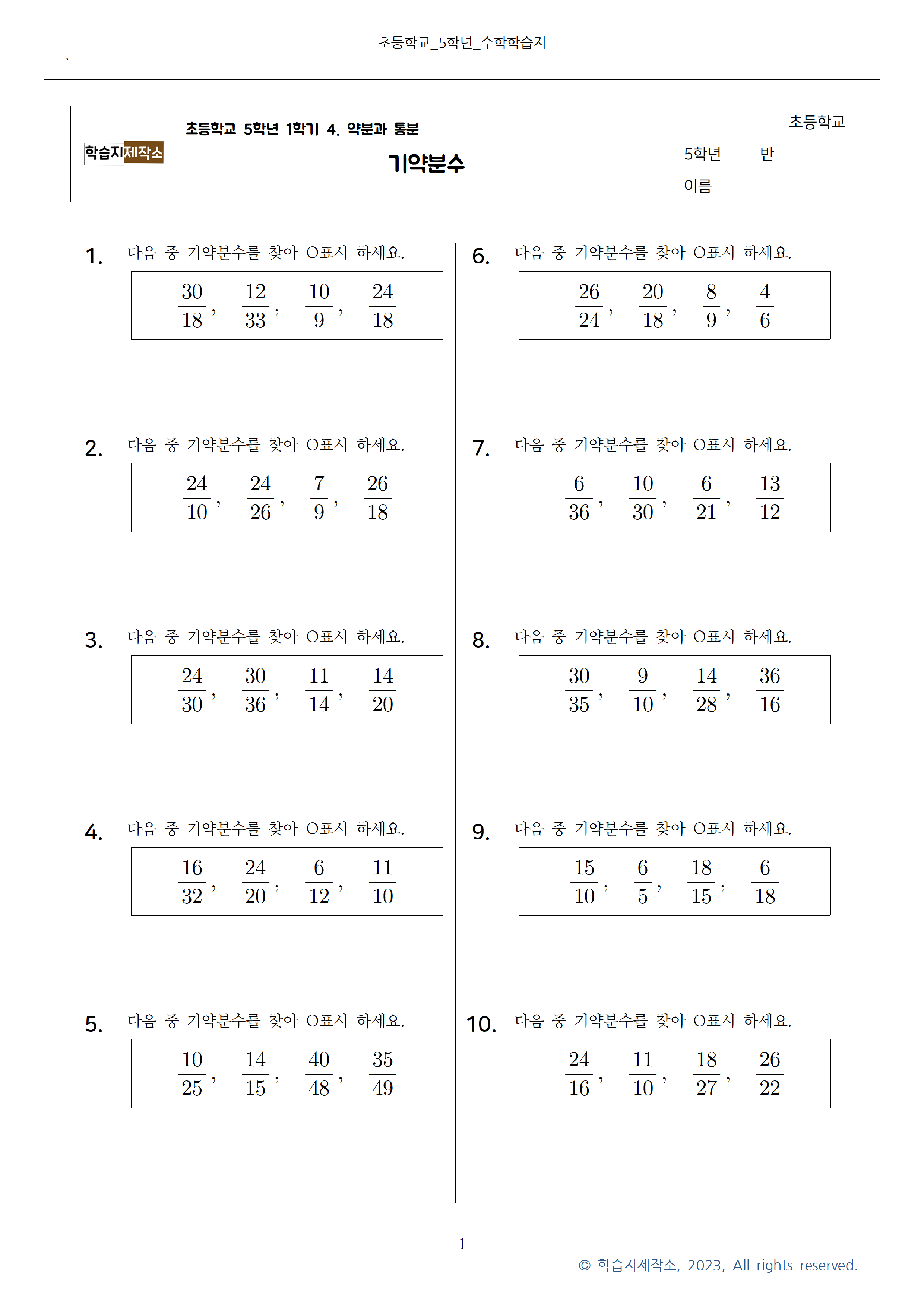 연습문제 학습지는 기약분수 찾기 20문제, 기약분수로 나타내기 30문제로 구성했습니다.