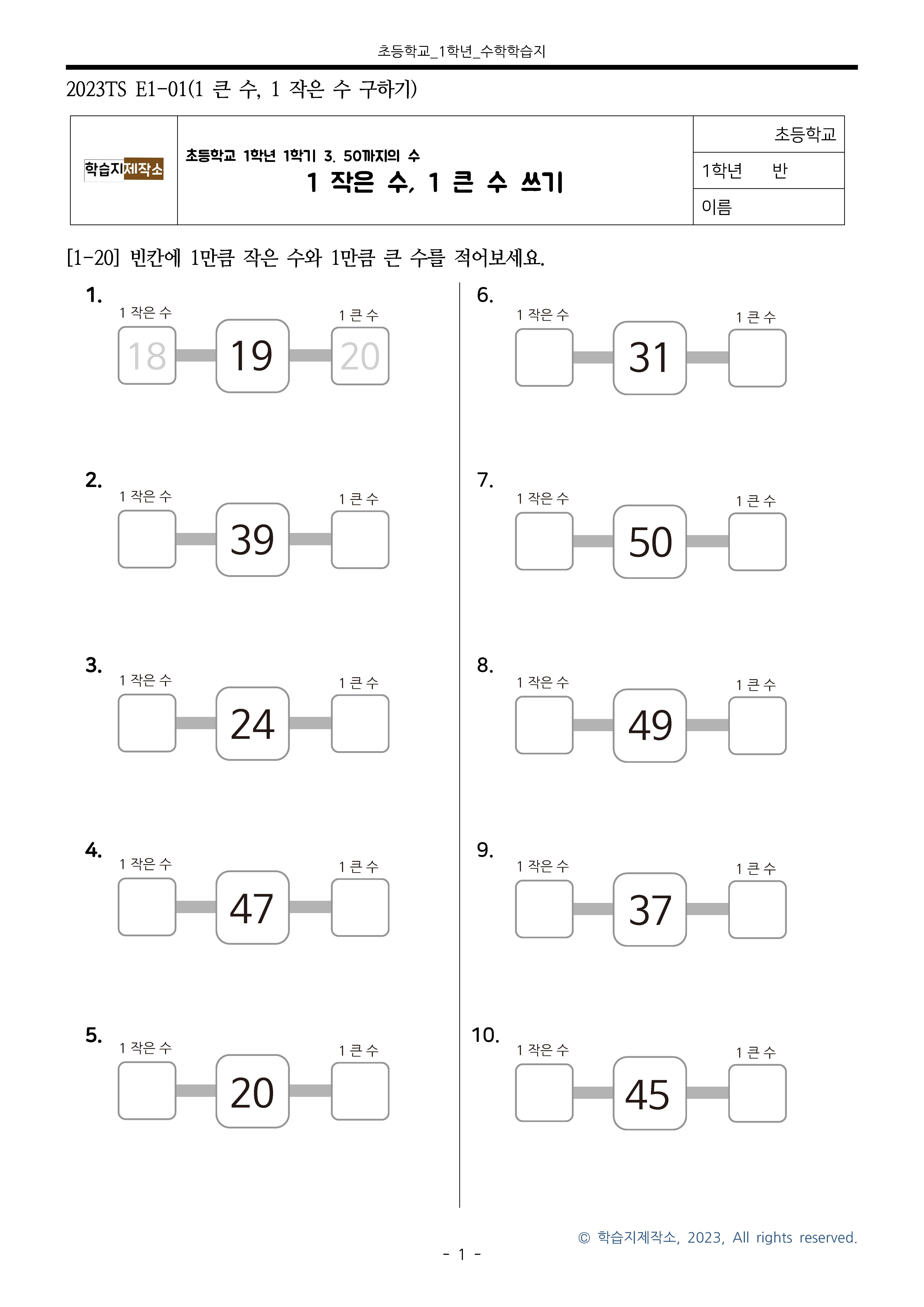 이번 학습지는 50까지의 수 중 하나의 수를 주고1 작은 수와 1 큰 수를 써보는 문제로 구성했습니다.