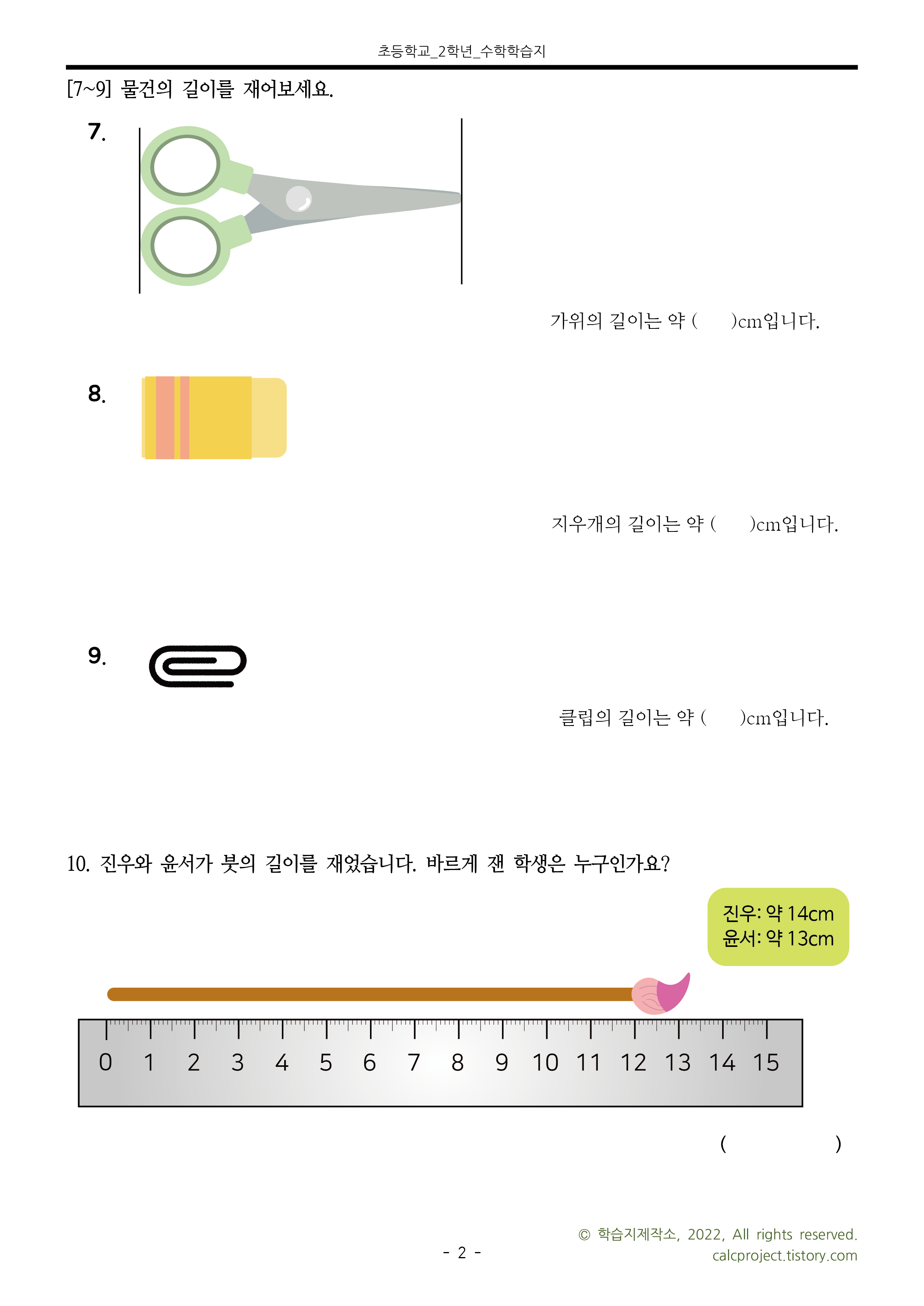 활동지는 자를 이용하여 '약 몇 cm'로 나타내기 문제를 담아보았습니다.