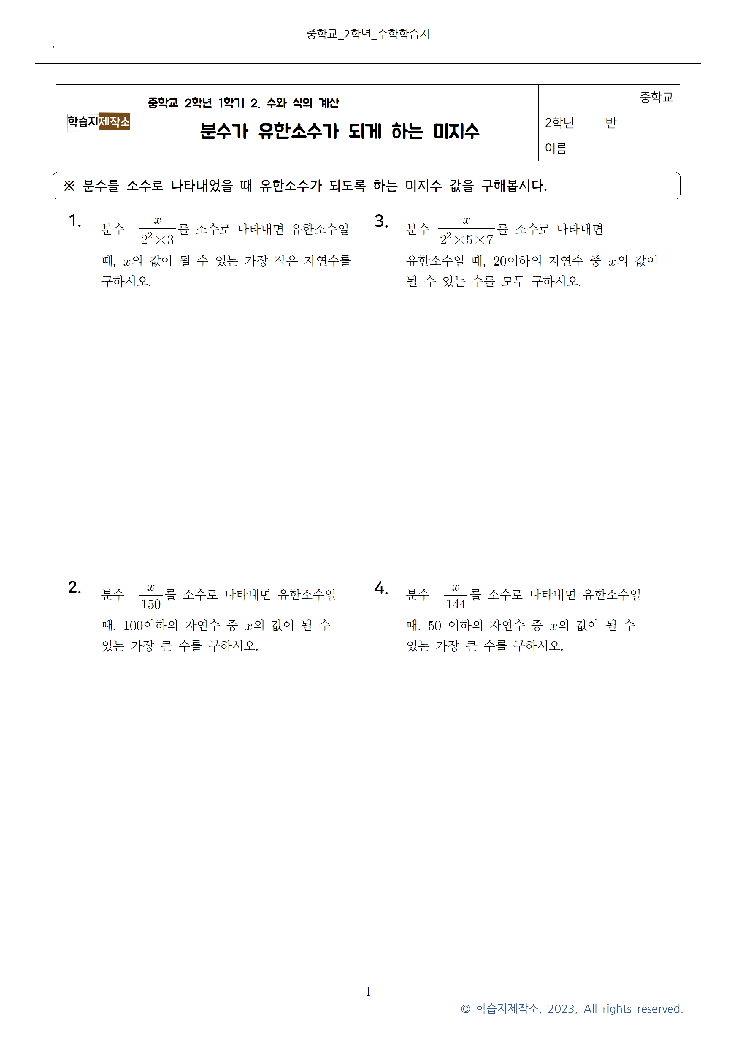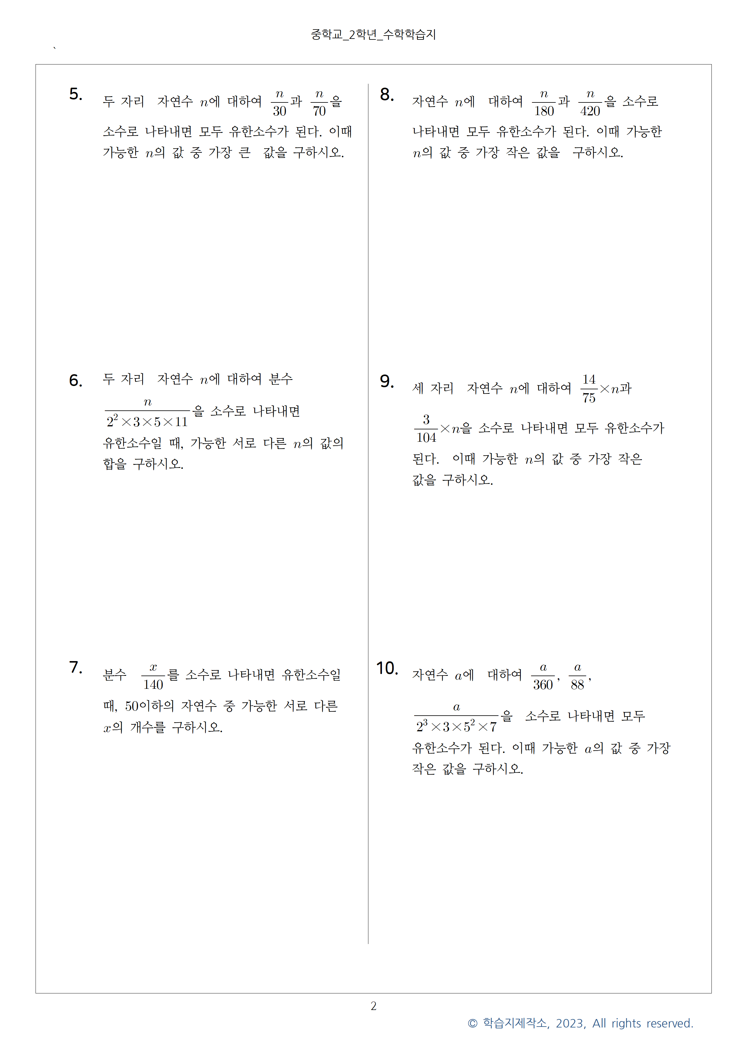이번 시간에는 중학교 2학년 수학 중 분수가 유한소수가 되도록 하는 n(또는 x)의 값을 구하는 문항으로 준비해보았습니다. 유한소수로 나타낼 수 있는 분수의 조건이 무엇인지 정리해 놓은 뒤 문제를 풀어봅시다. 문제지 뒷부분에 해설지도 같이 첨부했으니, 공부하실 때 활용하시면 좋겠습니다.