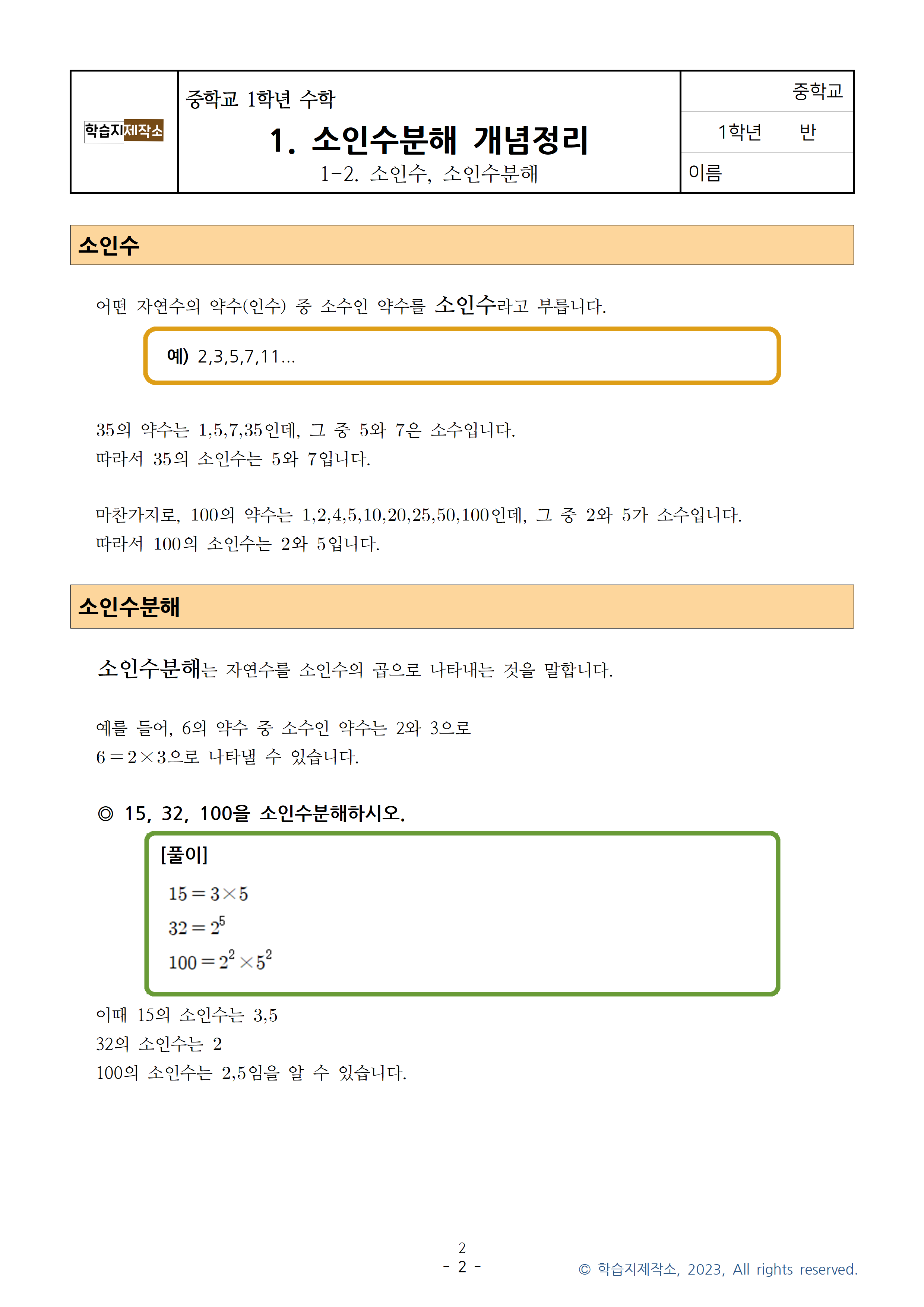 * 1단원 소인수분해 개념정리 학습지 모음