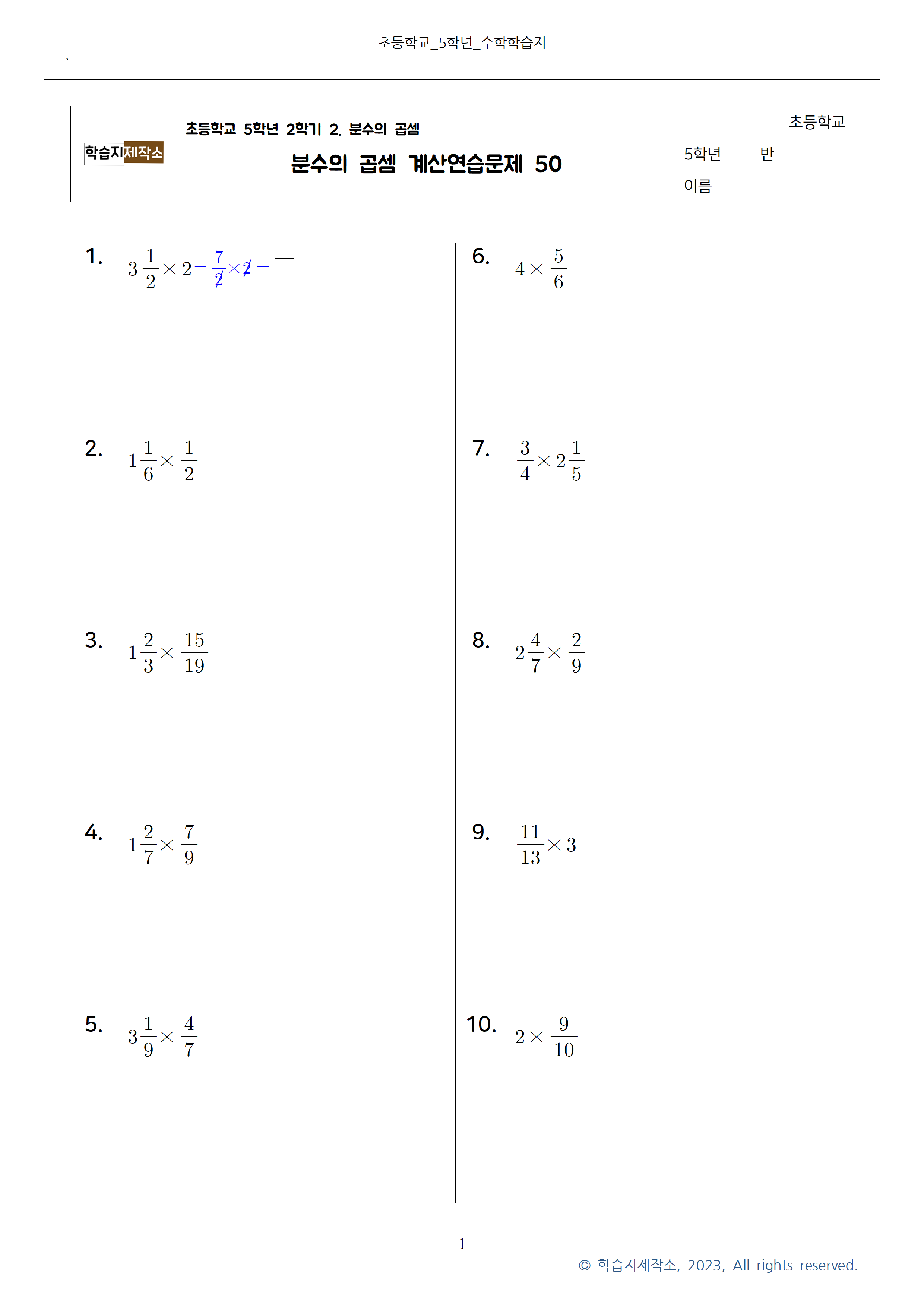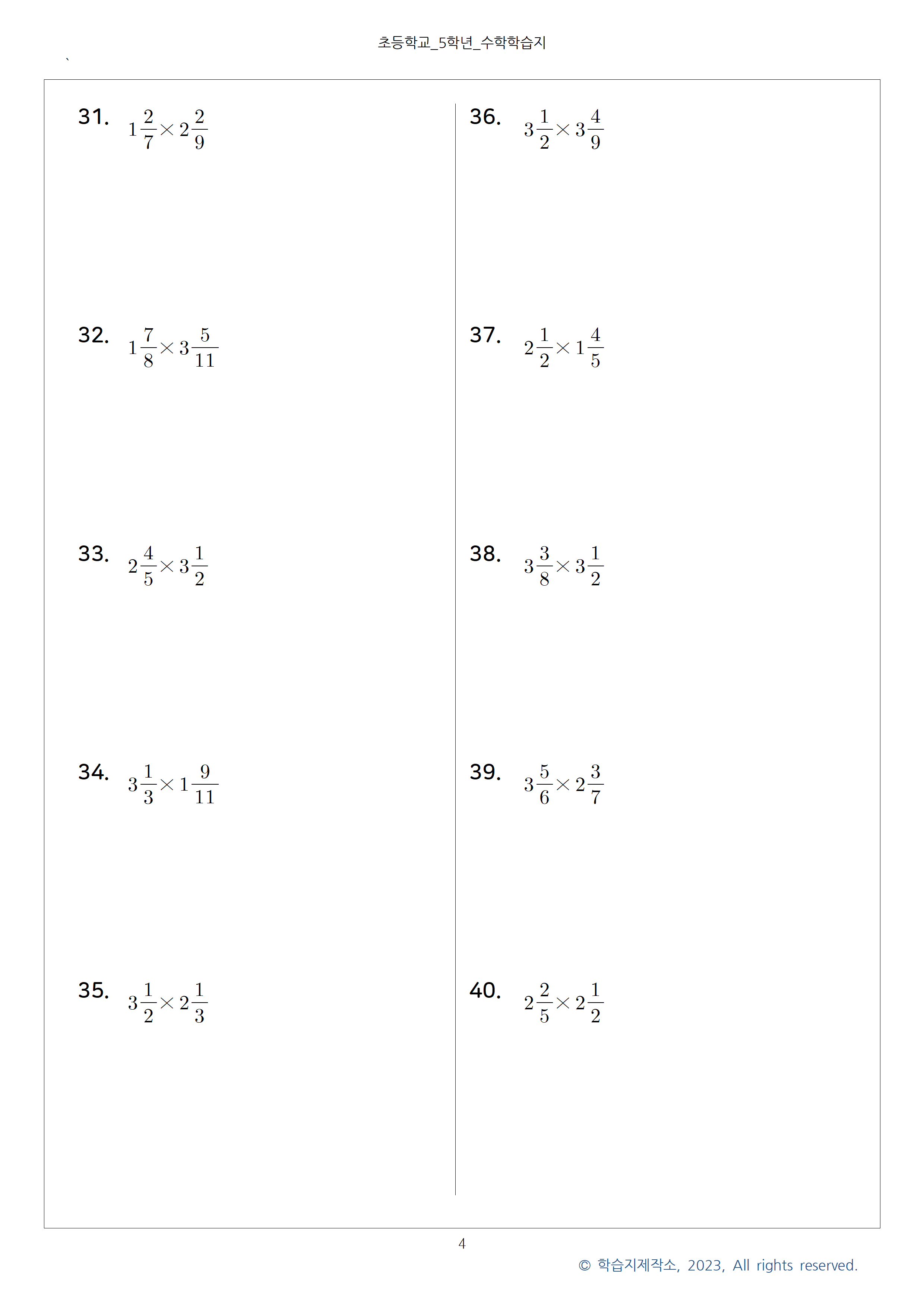 이번 학습지는 분수의 곱셈 50문제로, 1~30번까지는 자연수와 분수의 곱셈, 분수와 분수의 곱셈을 다루었습니다. 아울러 31번부터는 대분수끼리의 곱셈을 집중적으로 연습할 수 있도록 만들었습니다.