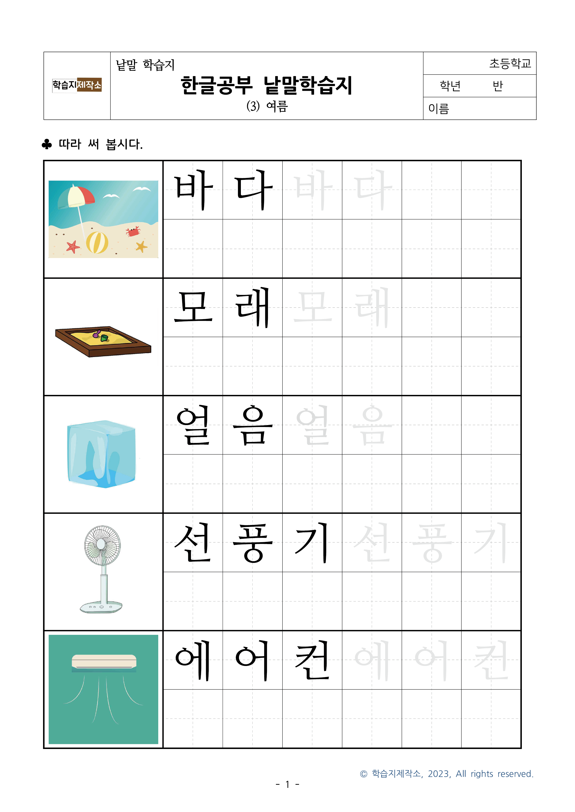 1) 1쪽(기본 학습) - 여름 낱말 5가지 따라 쓰기/보고 쓰기