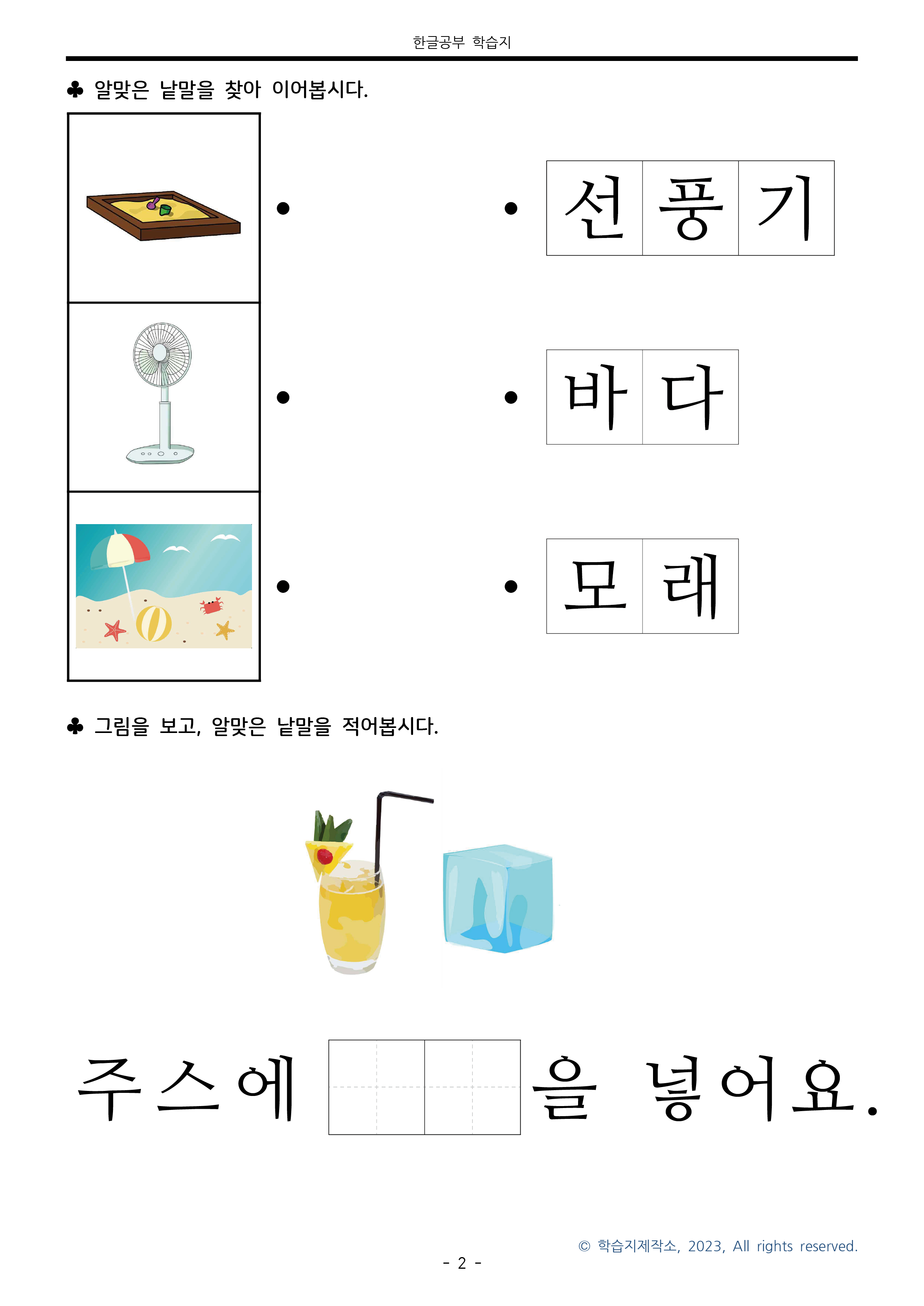 이번 시간에는 다가오는 여름을 주제로 낱말쓰기 학습지를 준비해보았습니다.