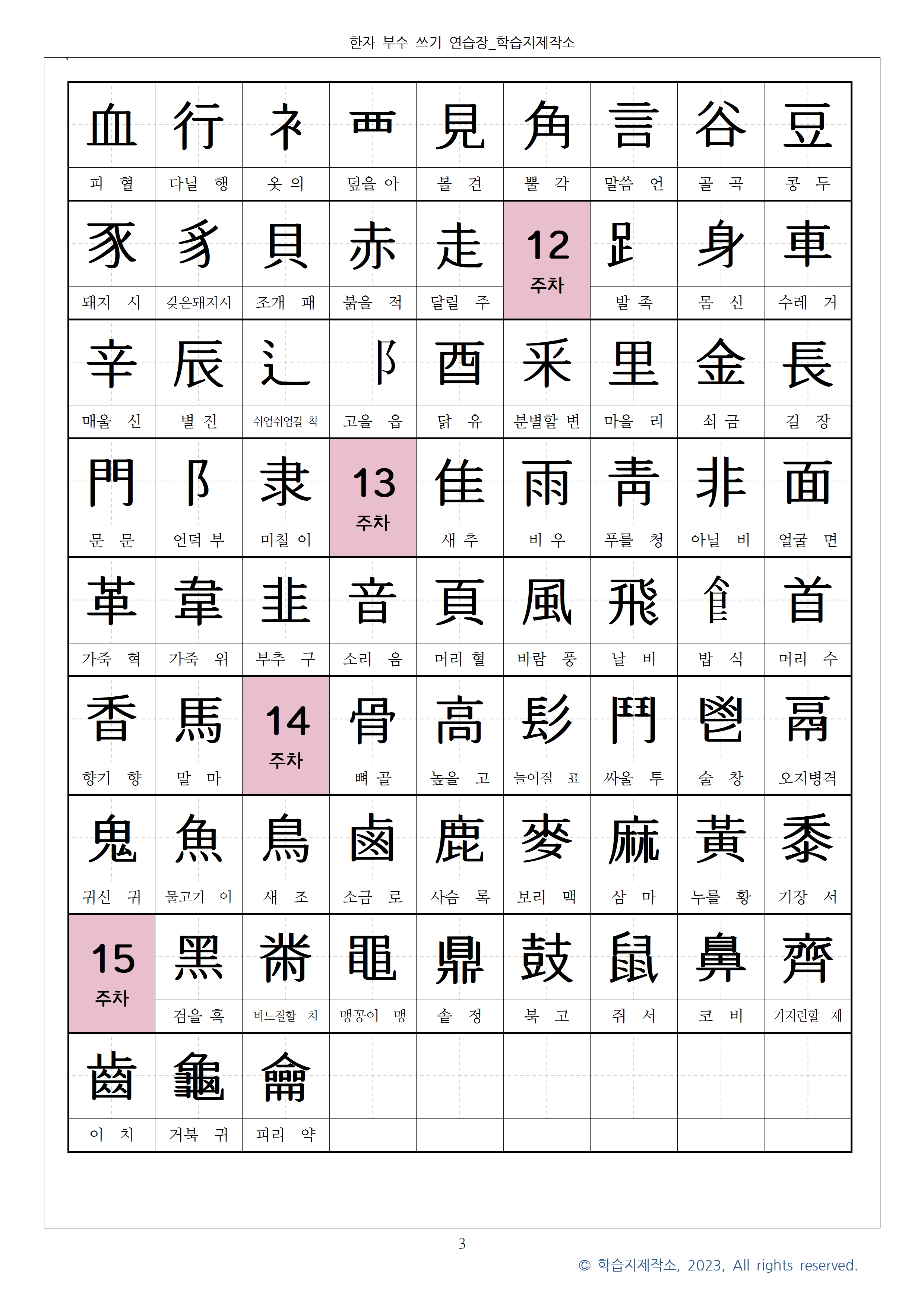 획순을 기준으로 수록하여 15주차로 갈수록 부수의 획수가 많아집니다.