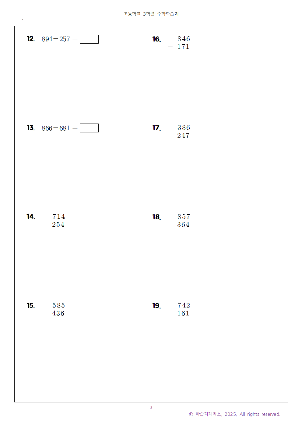 | 2025 최신판) 받아내림이 없는 세 자리 수의 뺄셈 (개념+학습지 자료) (0) | 2025.03.15 |