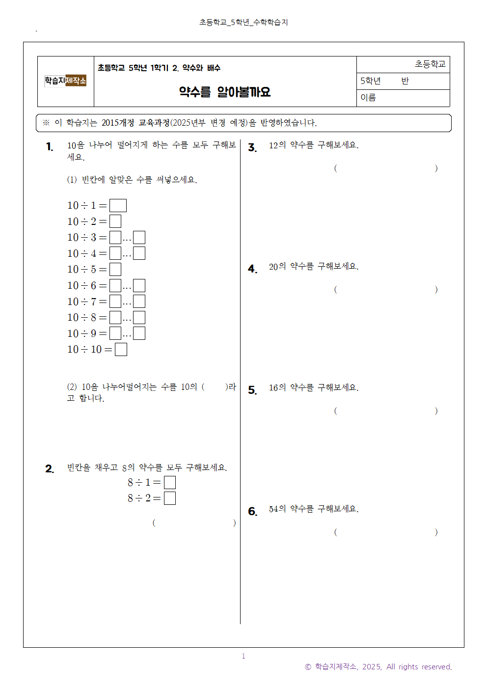 #태그 : 약수와 배수, 수학 약수, 약수 뜻, 약수를 알아볼까요, 학습지제작소, 약수 구하는 법