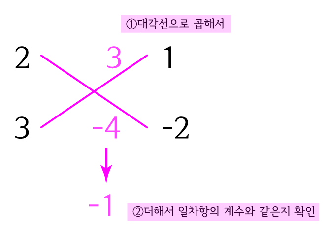 계수를 놓고 대각선으로 곱하는 방법으로 인수분해한 식을 찾는 연습이 필요합니다.