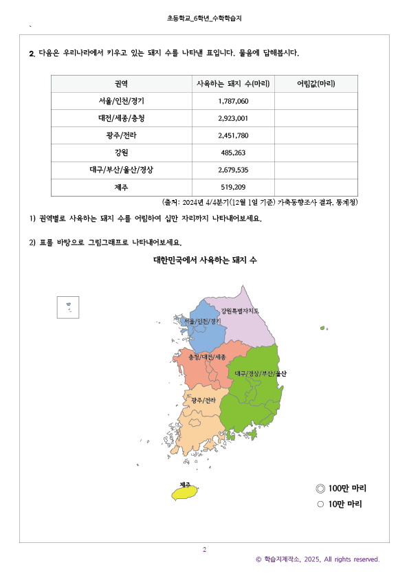 | 권역 | 사육하는 돼지 수(마리) | 어림값(마리) |