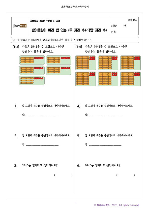 | 받아올림 없는 몇십몇 곱하기 몇 | 초등학교 3학년 1학기 곱셈 (0) | 2025.05.01 |
