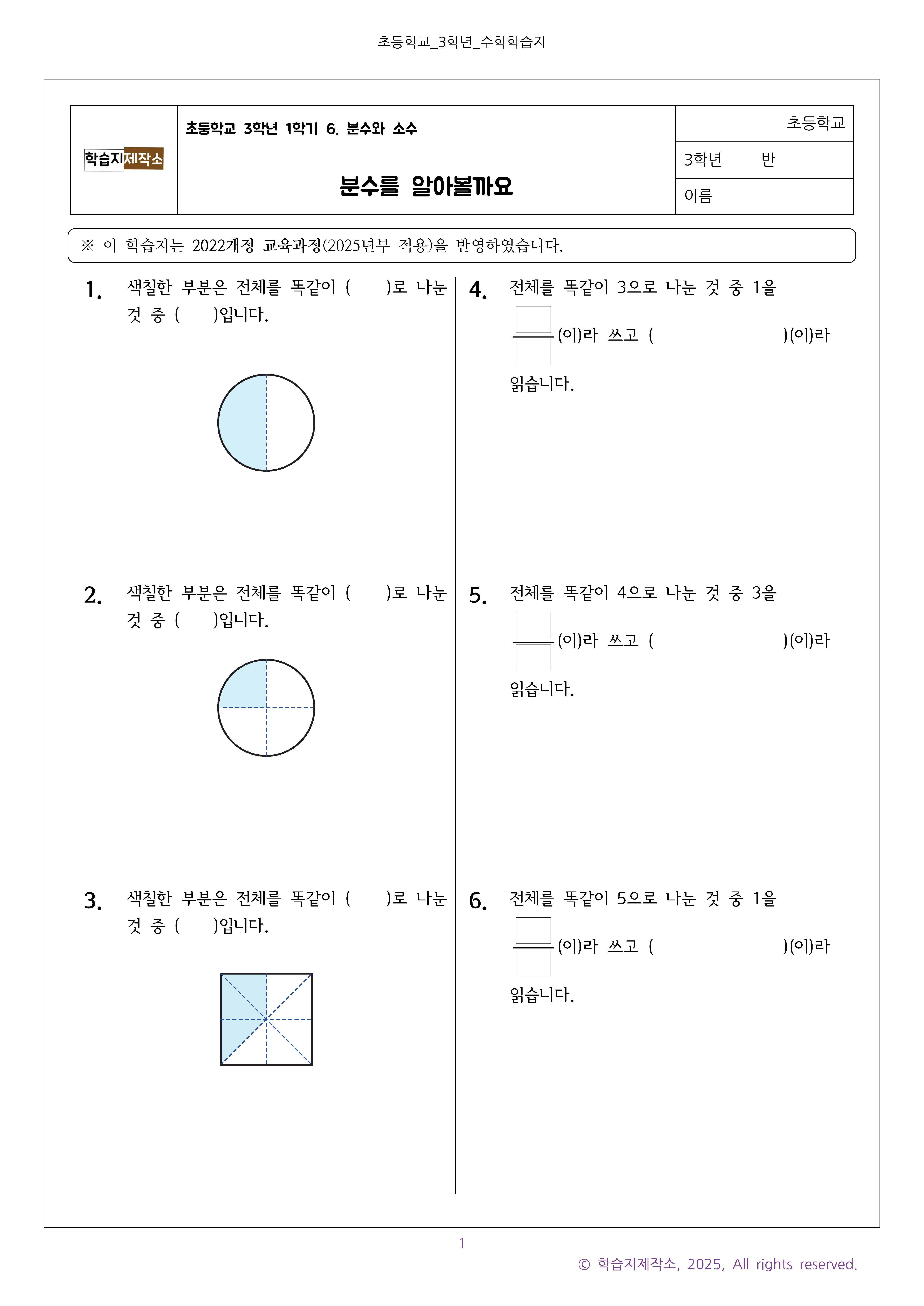 | [분수와 소수] 도형 똑같이 나누기 | 초3 수학 요점정리 수학학습지 (1) | 2025.05.08 |