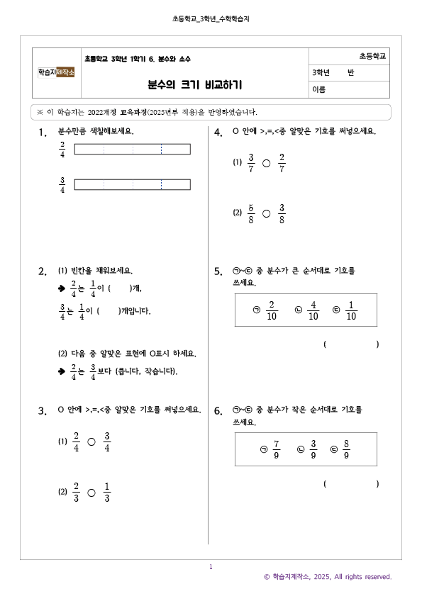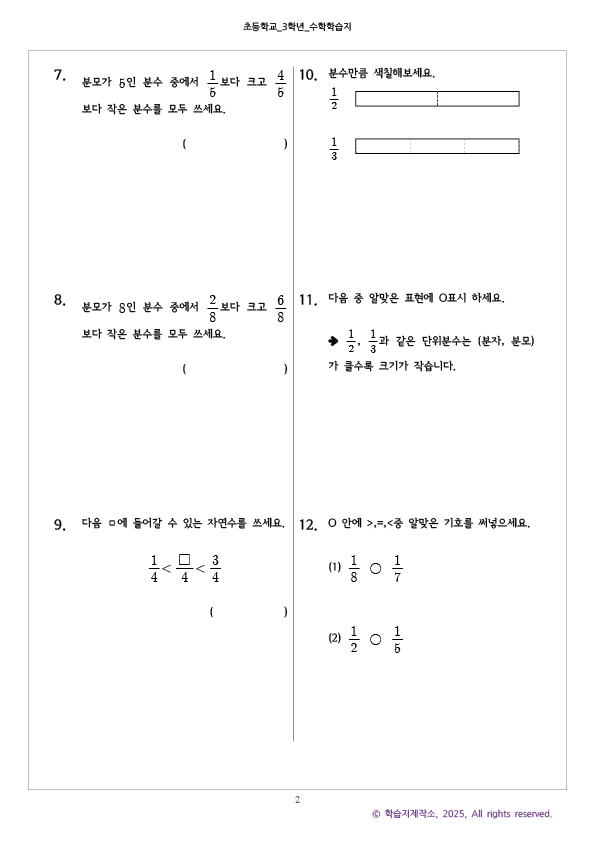 #태그 : 초3, 초등학교 3학년, 분수 비교, 동분모분수 비교 문제, 단위분수 비교 학습지, 학습지제작소