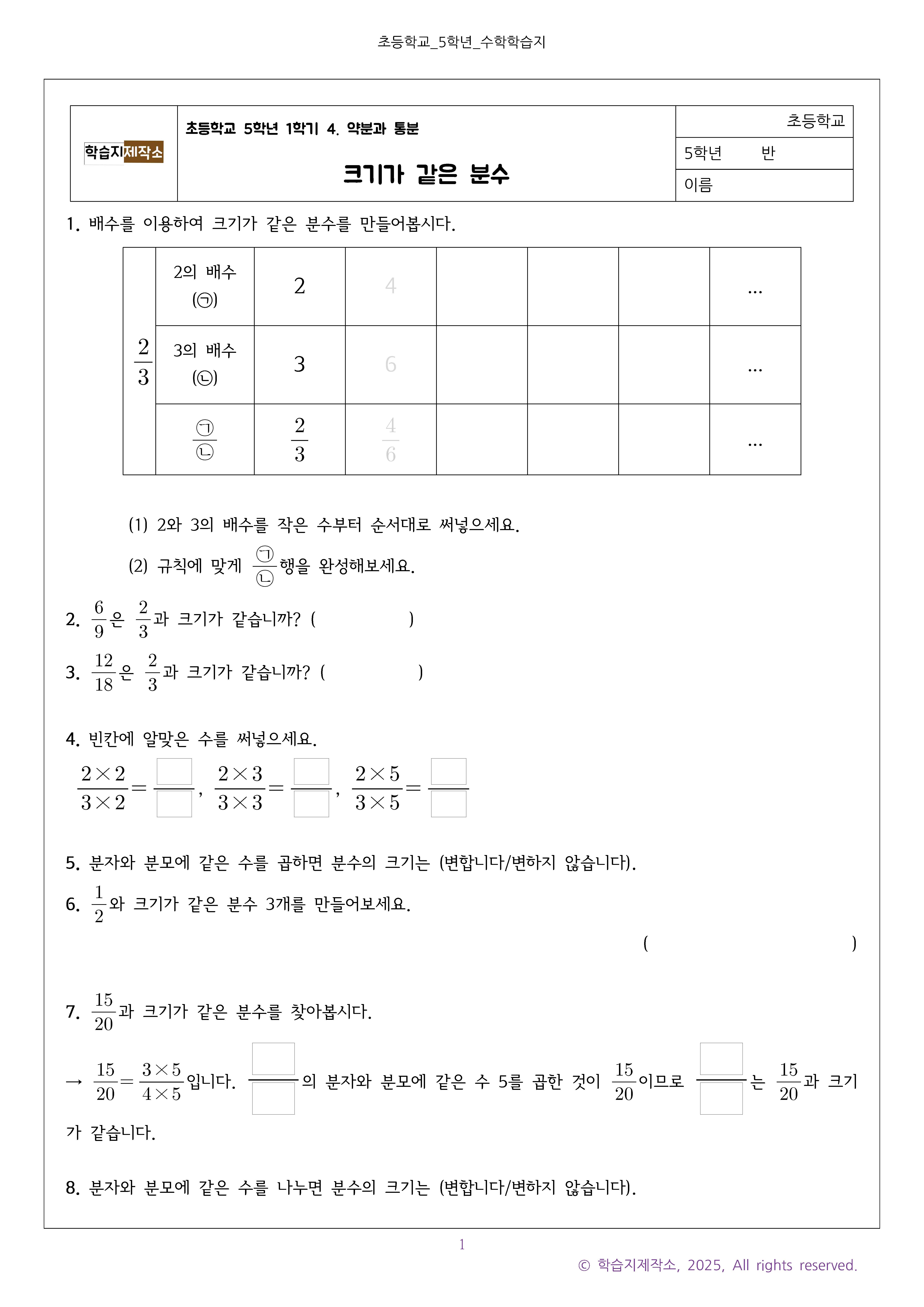 크기가 같은 분수 만들기 연습문제가 필요하시면 이 글을 참고하세요.