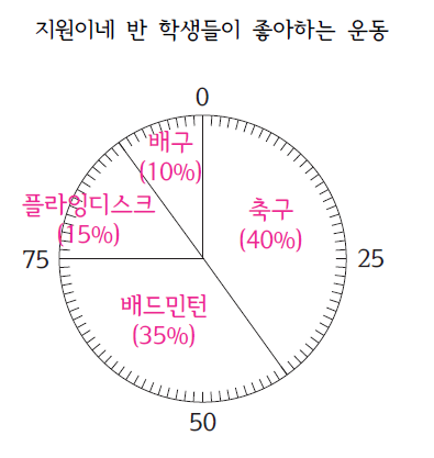 축구는 40%이므로 40칸, 배드민턴은 35칸, 플라잉디스크는 15칸, 배구는 10칸을 차지합니다.