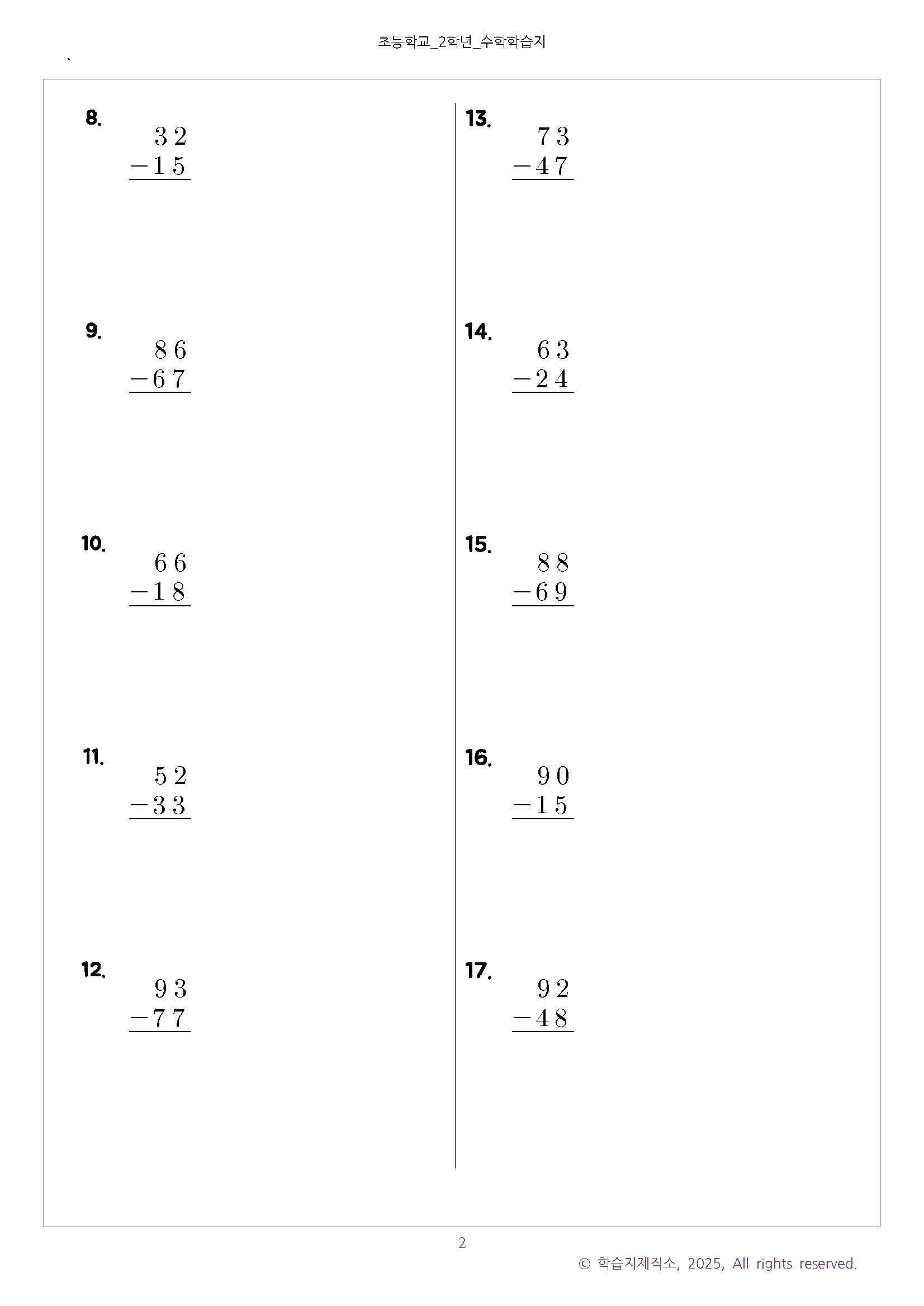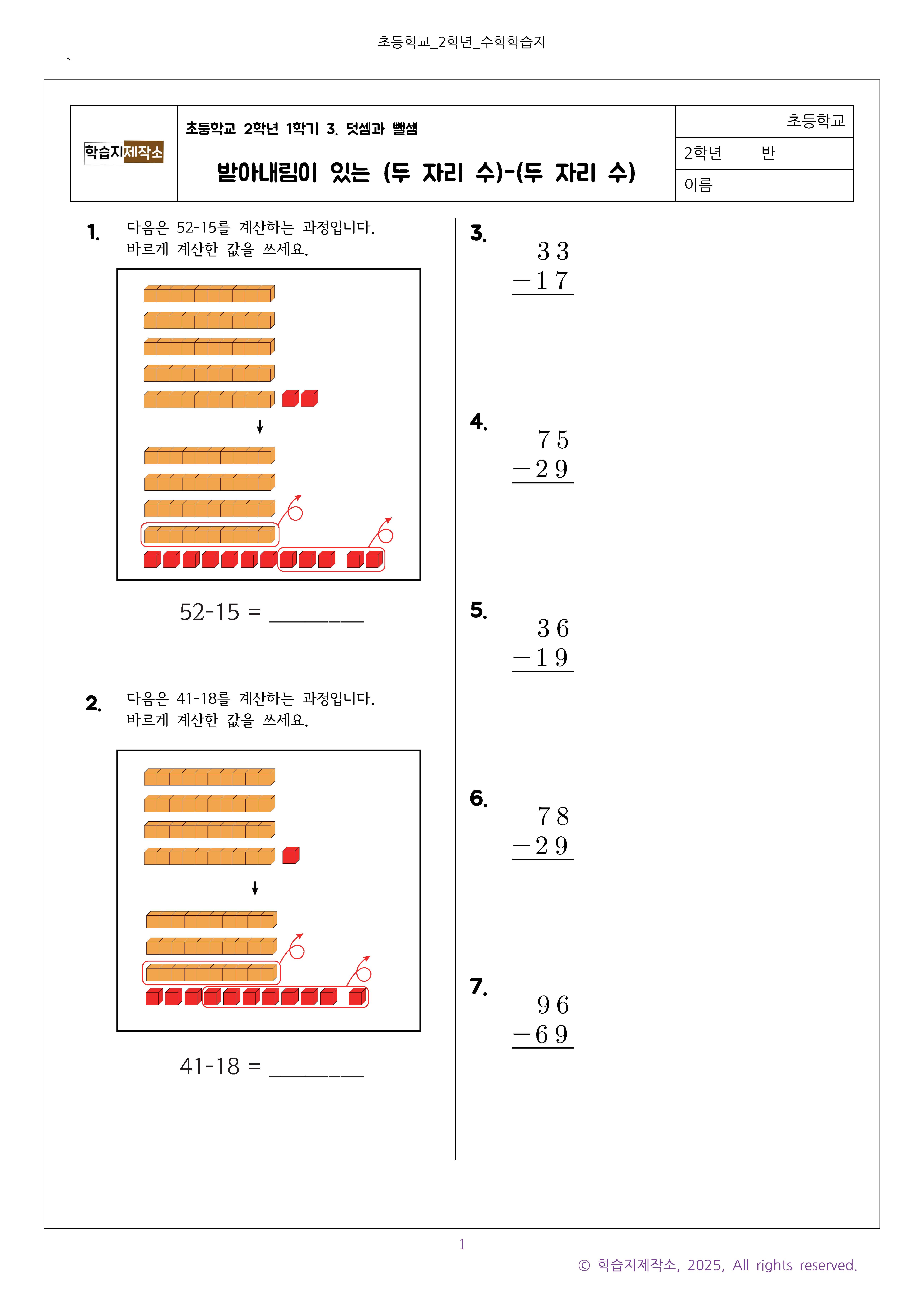 #태그 : 초2 수학, 초등학교 2학년, 받아내림이 있는 두 자리 수의 뺄셈, 두 자리 수-두 자리 수 문제, 초2 수학문제, 학습지제작소