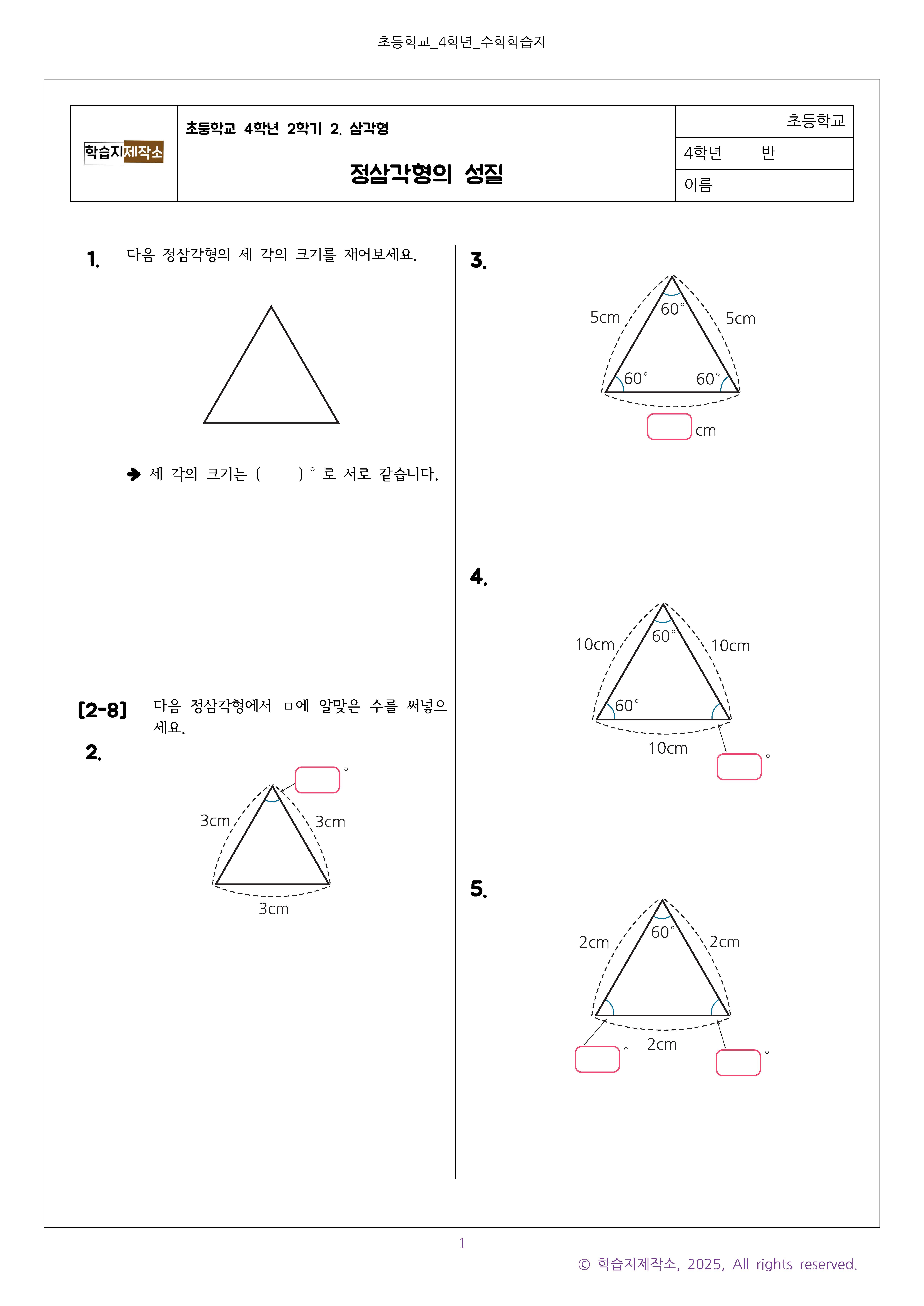#태그 : 초4, 초등학교 4학년, 삼각형, 정삼각형의 성질, 학습지제작소, 수학 문제