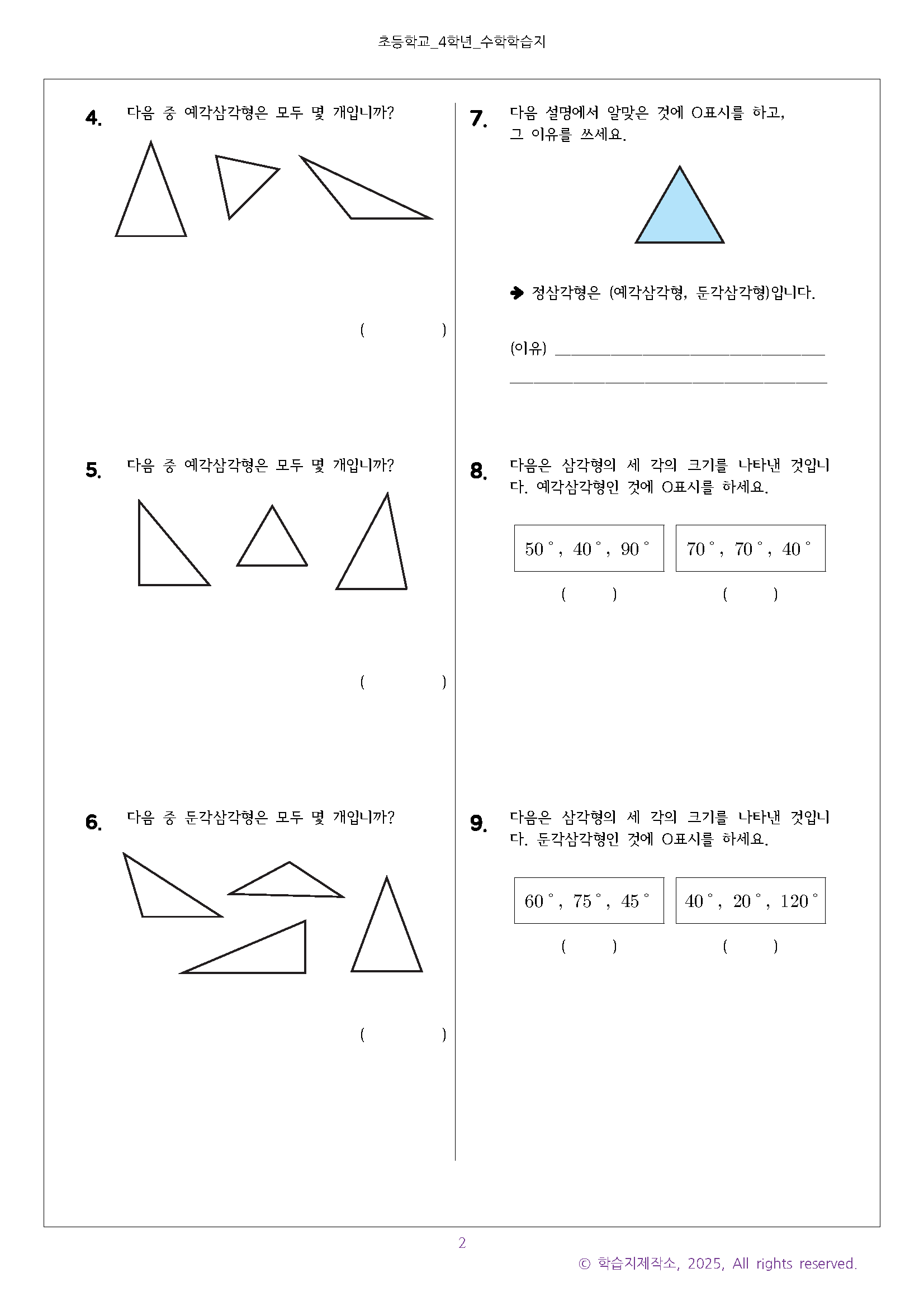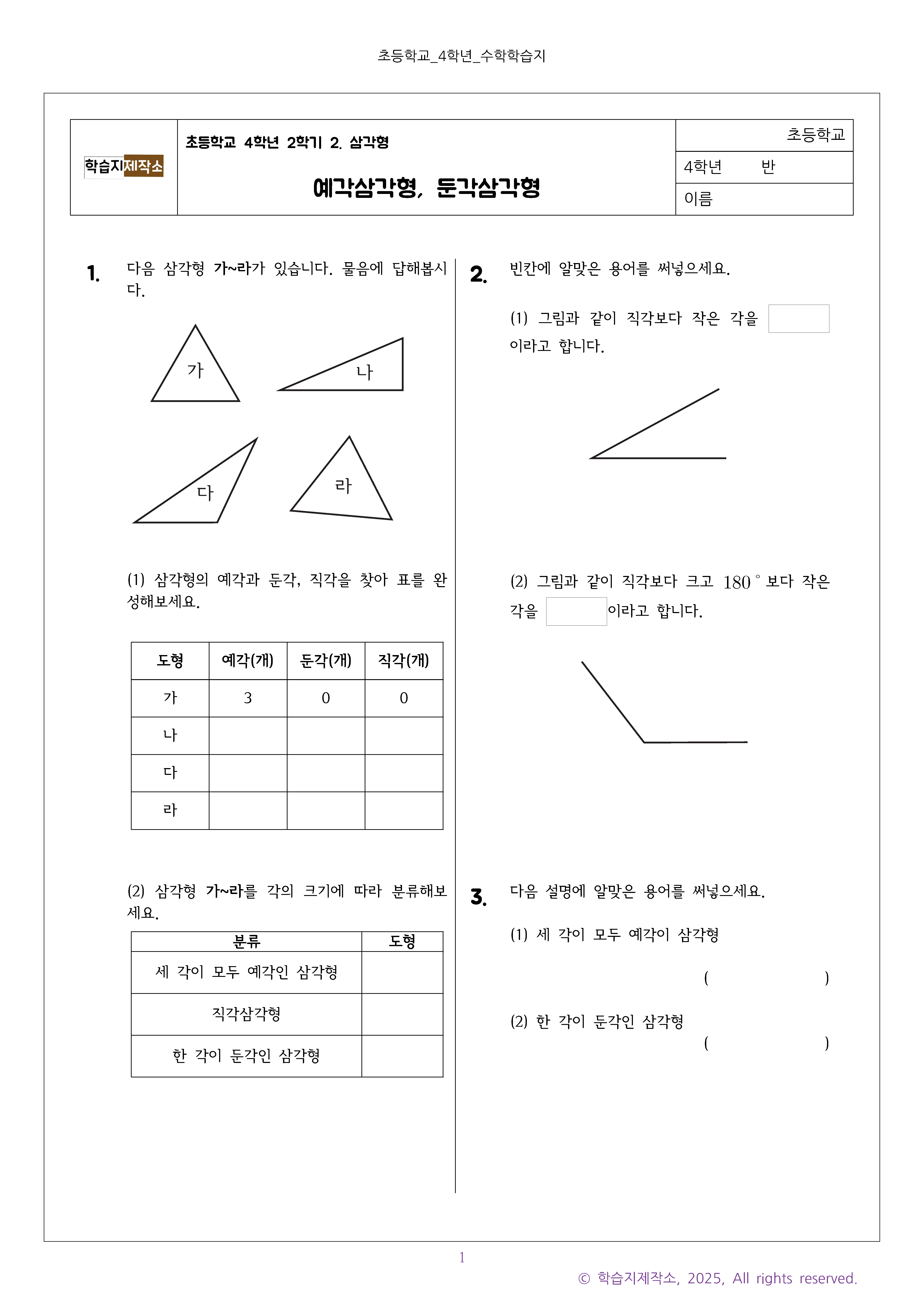 #태그 : 초4, 초등학교 4학년 수학, 삼각형, 예각삼각형 뜻, 둔각삼각형 뜻, 예각 둔각삼각형 문제, 수학학습지, 학습지제작소