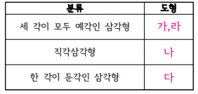삼각형 가~라의 예각, 둔각, 직각이 각각 몇 개인지 세어봅시다.