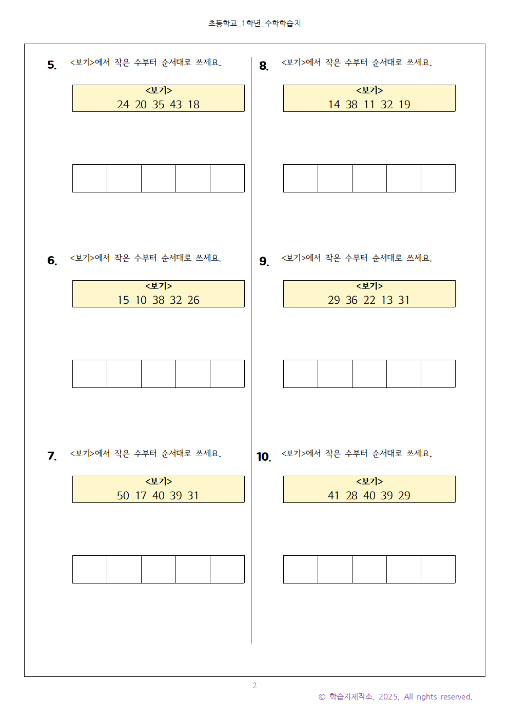 <보기>의 수 중 작은 수부터 순서대로 쓰기 연습문제 10제를