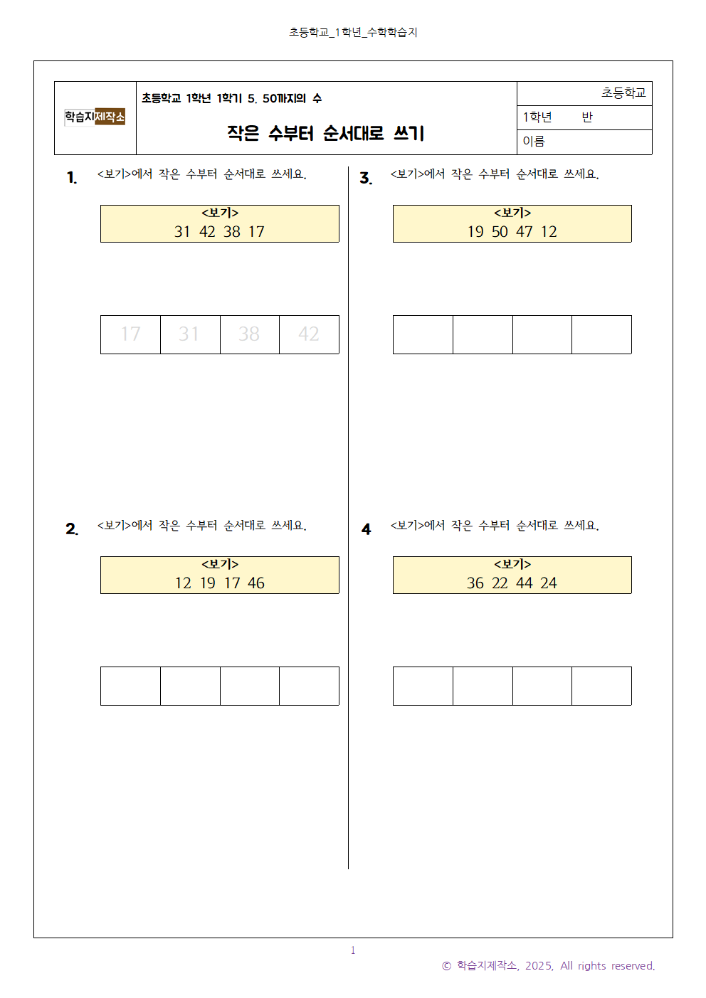#태그 : 초1 수학, 50까지의 수, 작은 수부터 쓰기 학습지, 초1 학습지