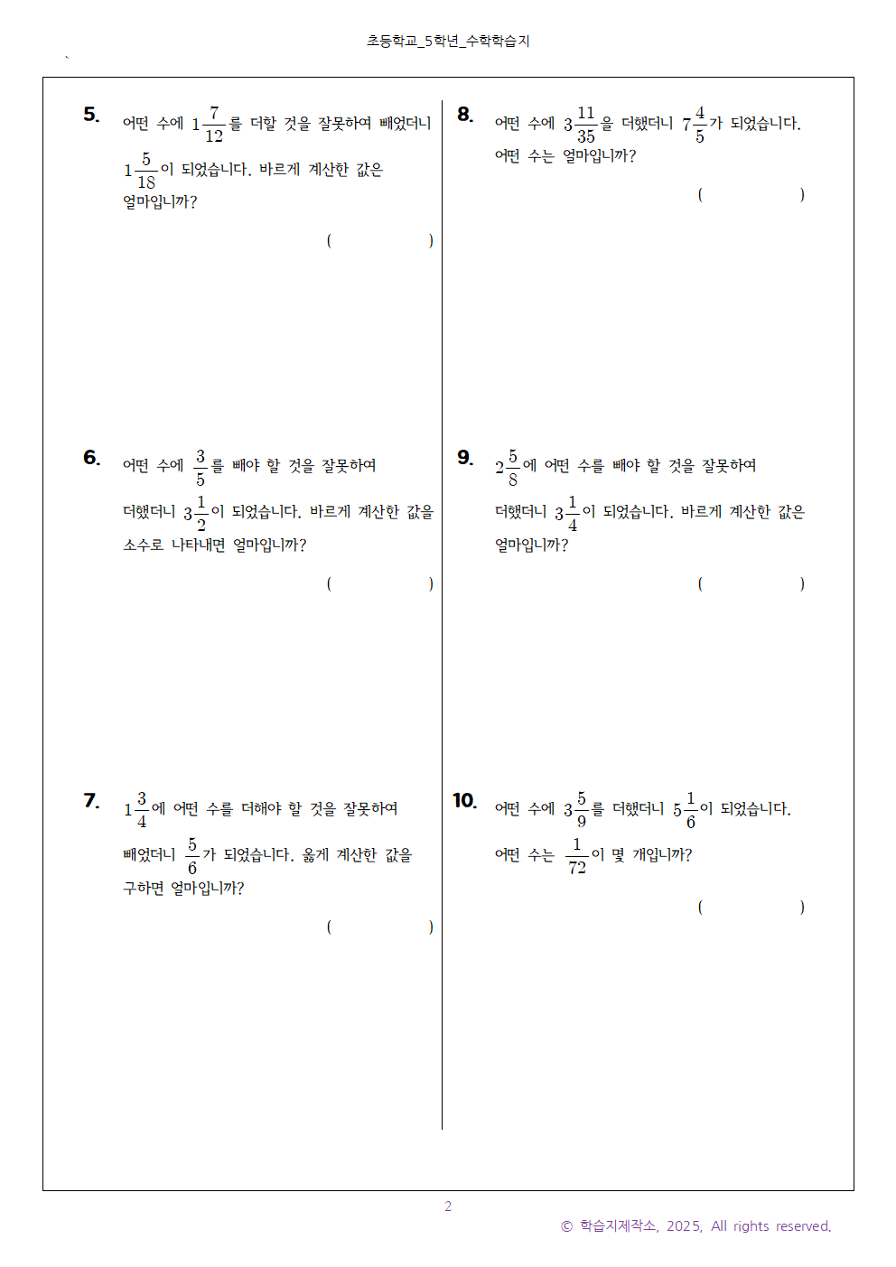 #태그 : 초5, 초등학교 5학년, 분수의 덧셈과 뺄셈 잘못 계산한 유형, 분수 덧셈 뺄셈 어떤 수 문제