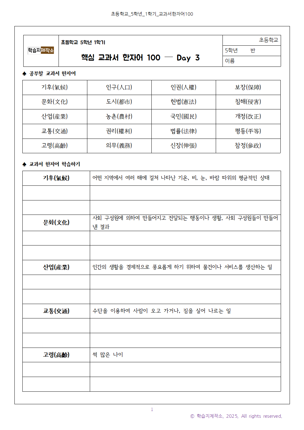 | 초등학교 5학년 1학기 교과서 한자어 100 - Day 1 (초5 국어 낱말 학습지) (0) | 2025.07.18 |