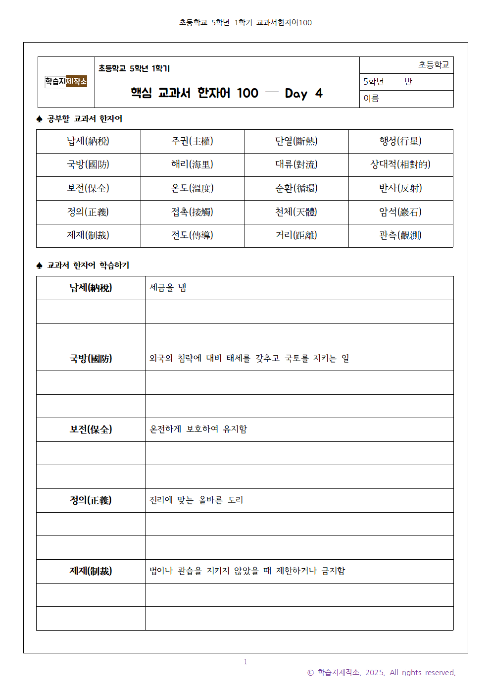 | 초등학교 5학년 1학기 교과서 한자어 100 - Day 1 (초5 국어 낱말 학습지) (0) | 2025.07.18 |