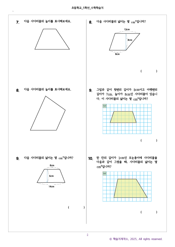 사다리꼴 넓이 차시 문제지와 정답지를 모두 올립니다.