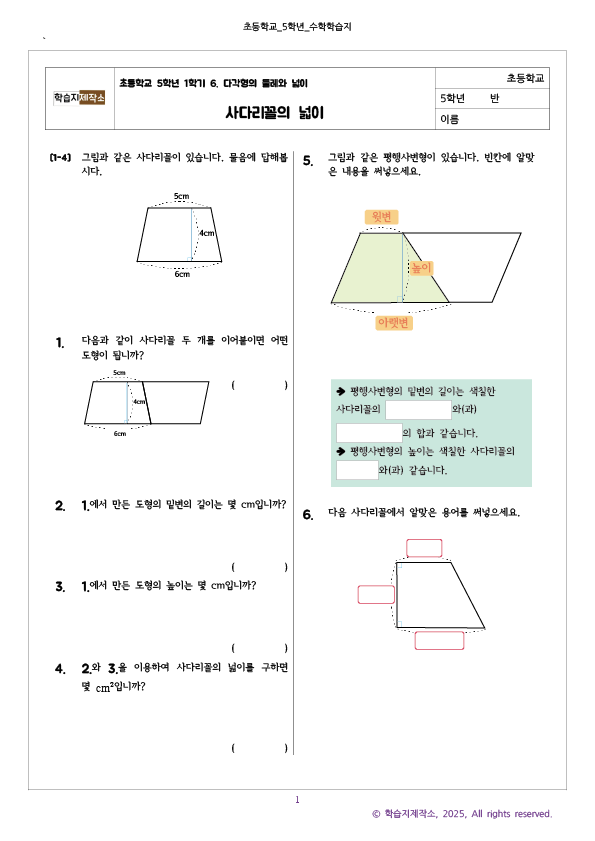 #태그 : 초5, 초등학교 5학년, 사다리꼴의 넓이 구하는 법, 사다리꼴 공식, 사다리꼴 학습지 모음, 수학문제, 학습지제작소