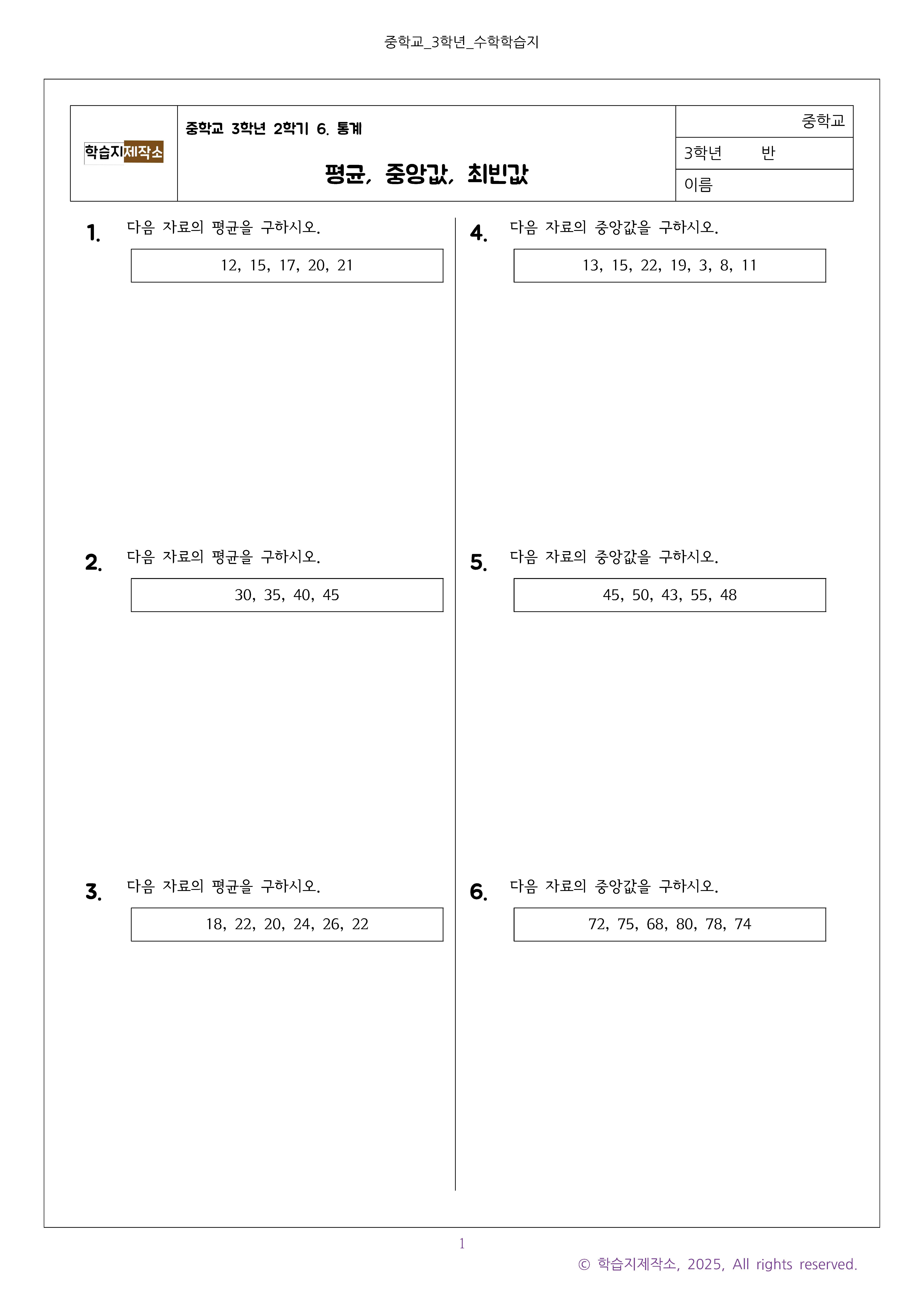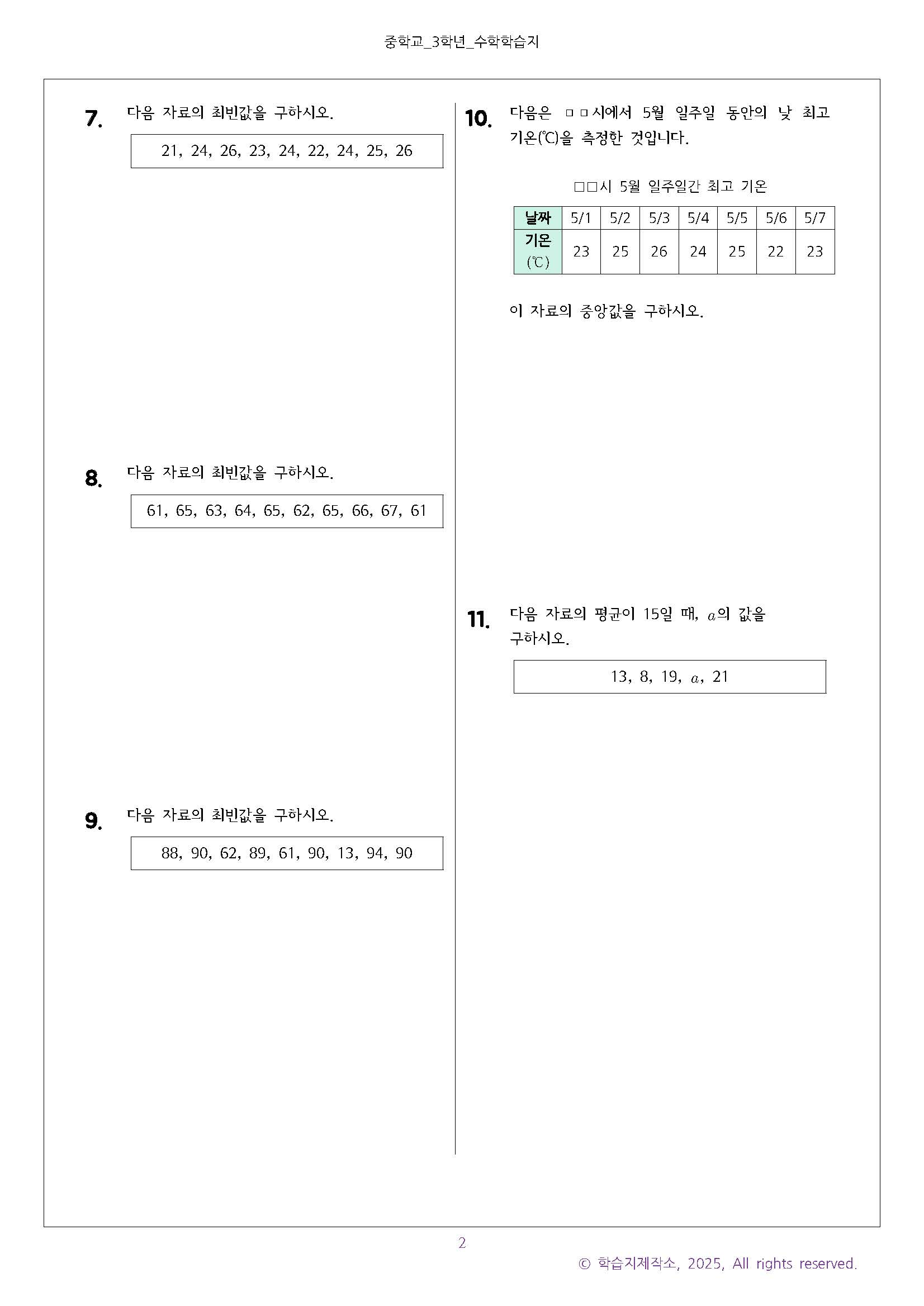 #태그 : 중3, 중학교 3학년 통계 문제, 중학교 평균 구하기, 중학교 중앙값 최빈값 뜻, 학습지제작소
