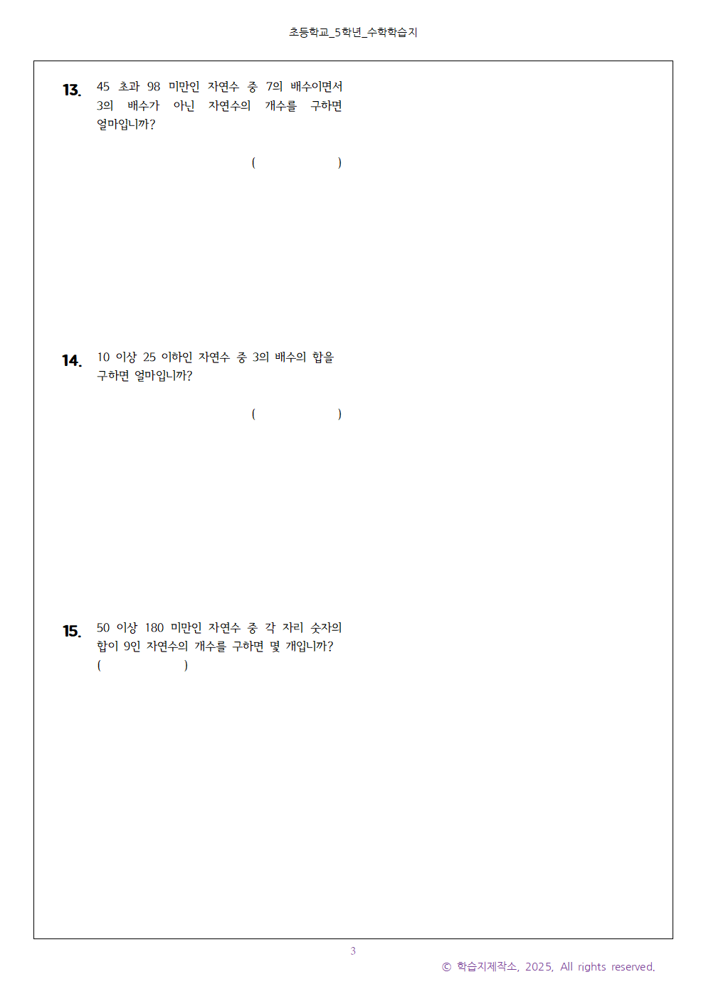 초5 유형 중 응용 유형인 '수의 범위를 바탕으로 조건에 알맞은 수 구하기' 15문항을 준비했습니다.