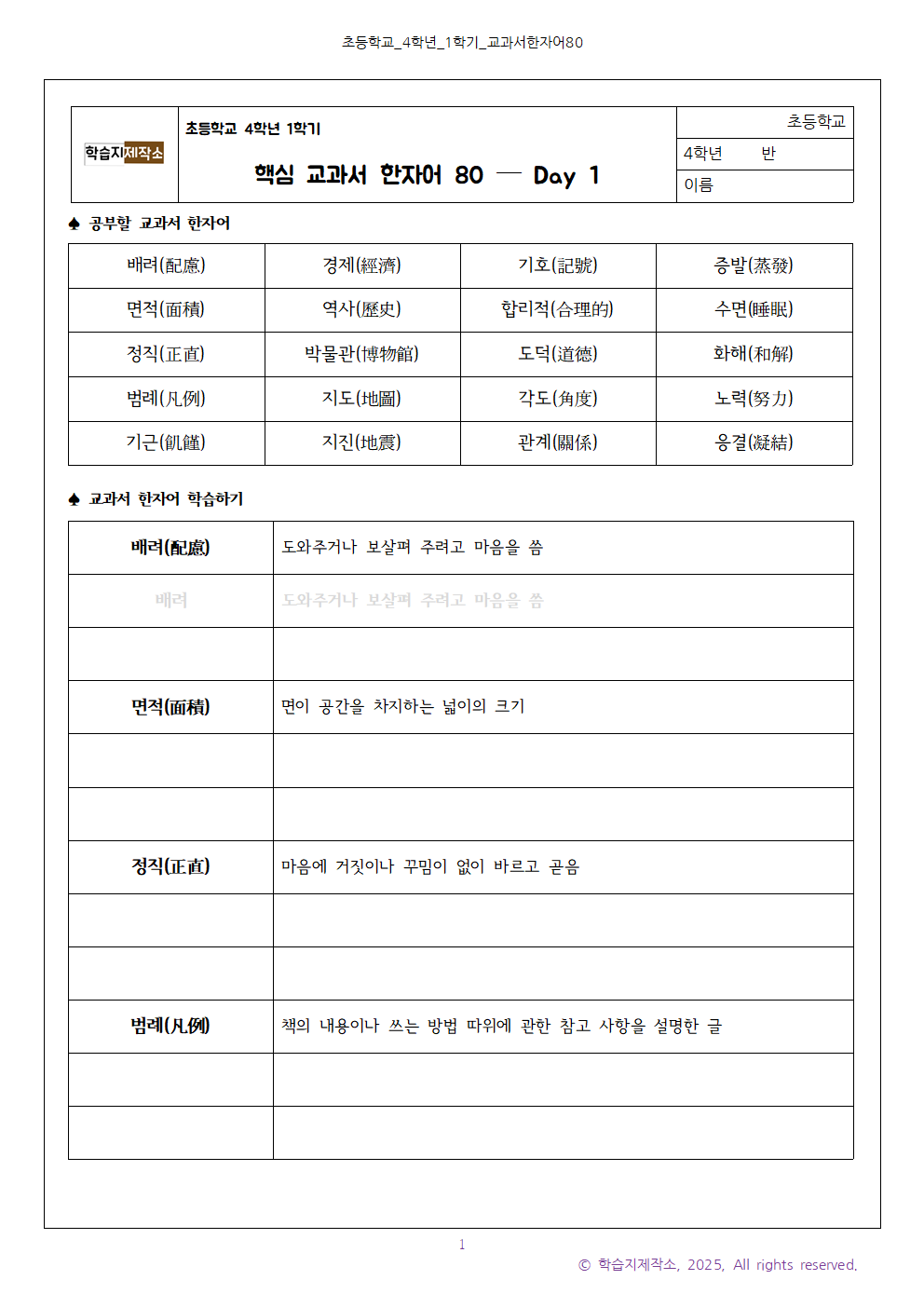 * 초등학교 4학년 1학기 교과서 한자어 80 - Day 1