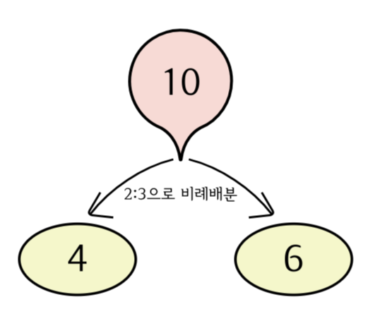 $10 \times \cfrac{3}{2+3} = 6$으로 4와 6으로 비례배분할 수 있습니다.