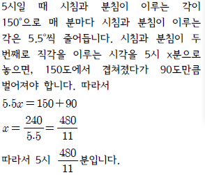 따라서 5시 $\cfrac{480}{11}$분입니다.