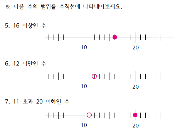 * 같이 보면 좋은 글• 이상, 이하, 초과, 미만• 하나의 수를 올림, 버림, 반올림하기 * 수의 범위를 수직선으로 나타내기수의 범위는 이상, 이하, 초과, 미만 용어를 사용하여 나타낼 수 있었습