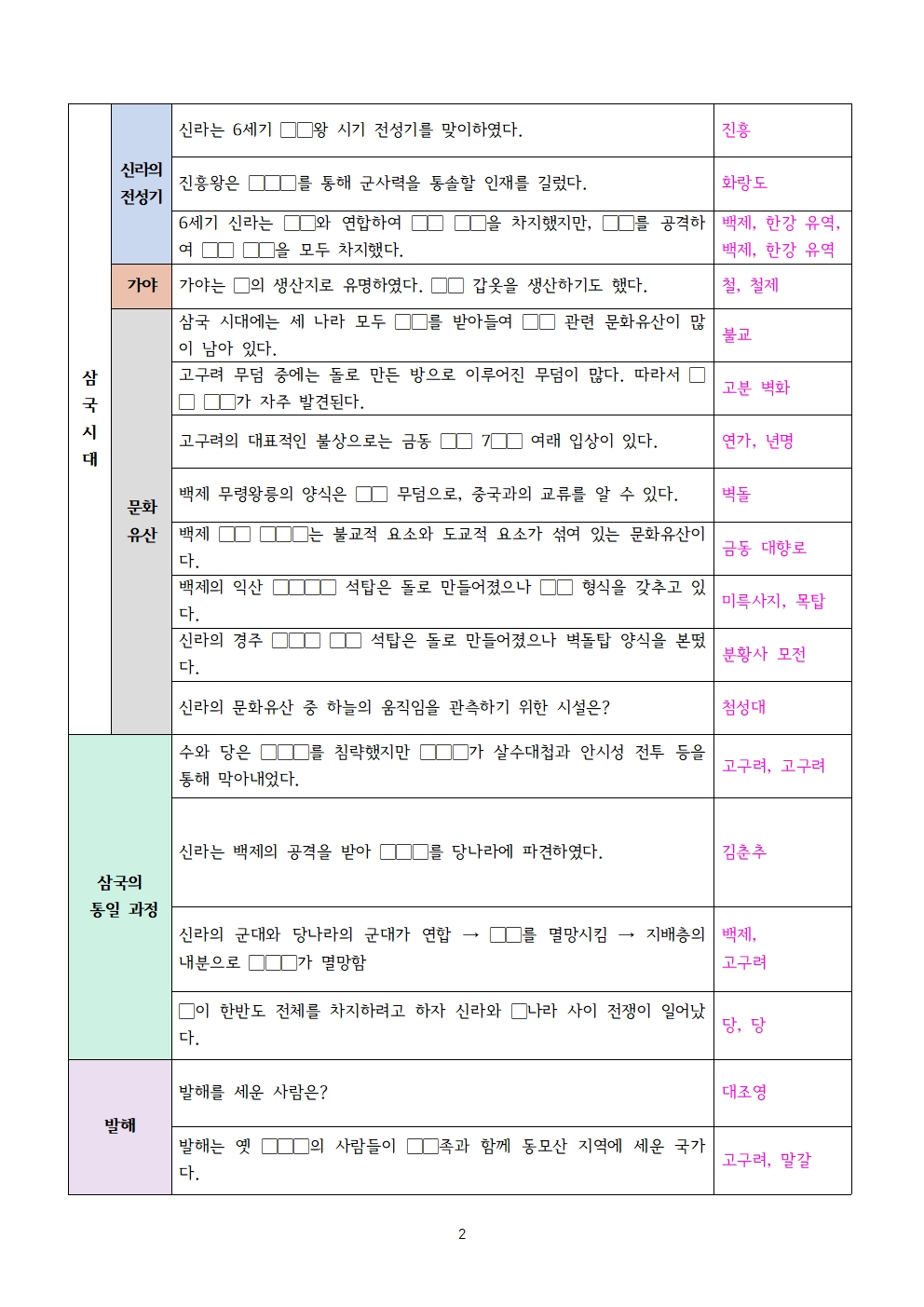 | 백제를 세운 인물은 ▢▢로, ▢▢ 유역(위례)에 백제를 세웠다. | 온조, 한강 | ||