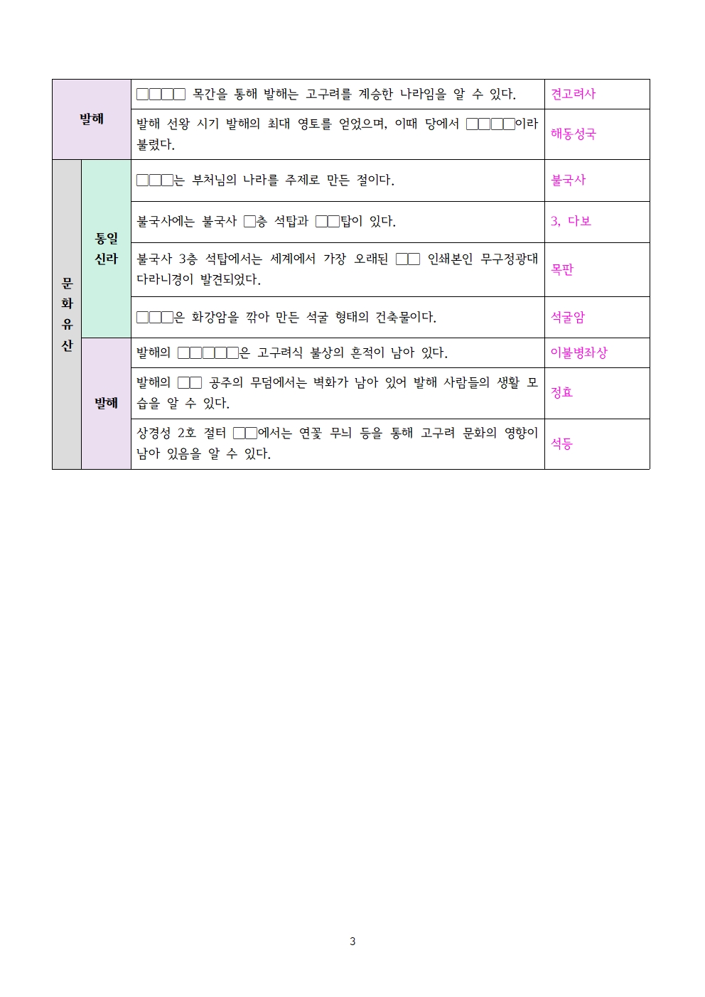 | 발해는 옛 ▢▢▢의 사람들이 ▢▢족과 함께 동모산 지역에 세운 국가다. | 고구려, 말갈 | ||