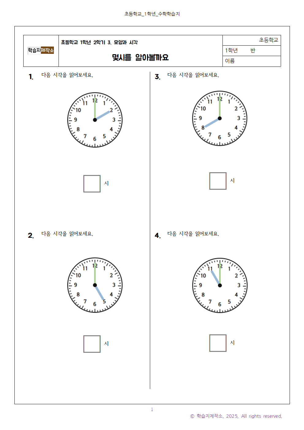 #태그 : 초1 수학, 시계 공부, 시계 읽기, 몇 시를 알아볼까요, 수학문제