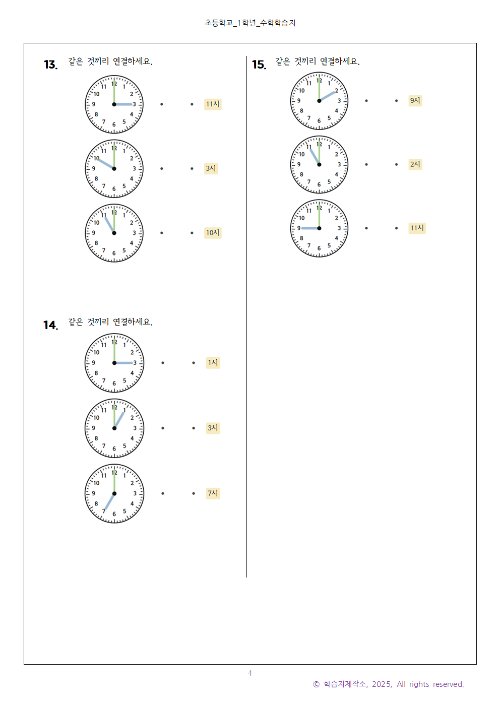 이번 시간에는 시계에서 시침을 보고 ‘몇 시’인지 읽는 방법을 함께 살펴보았습니다. 짧은 바늘이 가리키는 숫자를 찾으면 쉽게 몇 시인지 알 수 있습니다. 학습지로 함께 연습해보며 아이와 함께 시계 읽기를 연습해보면 좋겠습니다.