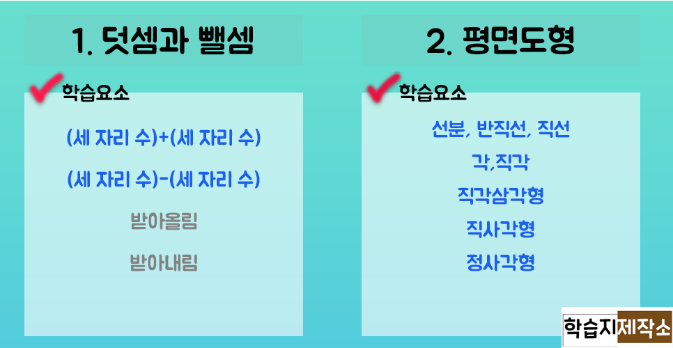 어떤 학년에 무엇을 배우는지 확인할 수 있습니다. 공부하기 전, 중, 후 모두 목차를 아는 것은 굉장히 중요합니다. 학년별로 어떤 단원에서 무엇을 배우는지 찾는 데 좋은 자료이니, 들러보시는 것을 추천드러요 :)